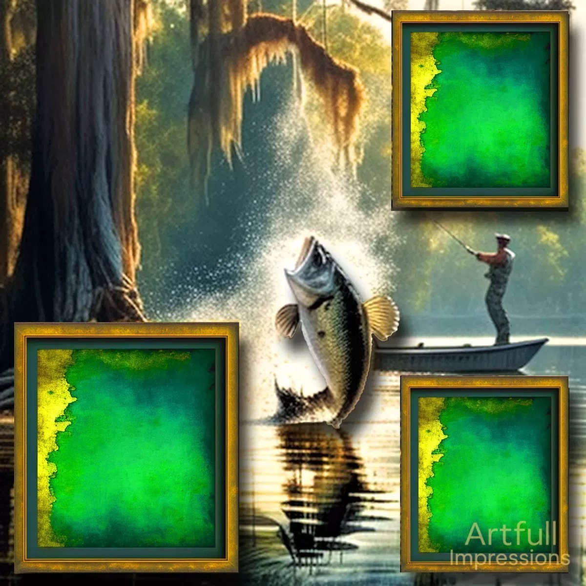 ? Stunning bass fishing action scene with 3 photo-ready mats