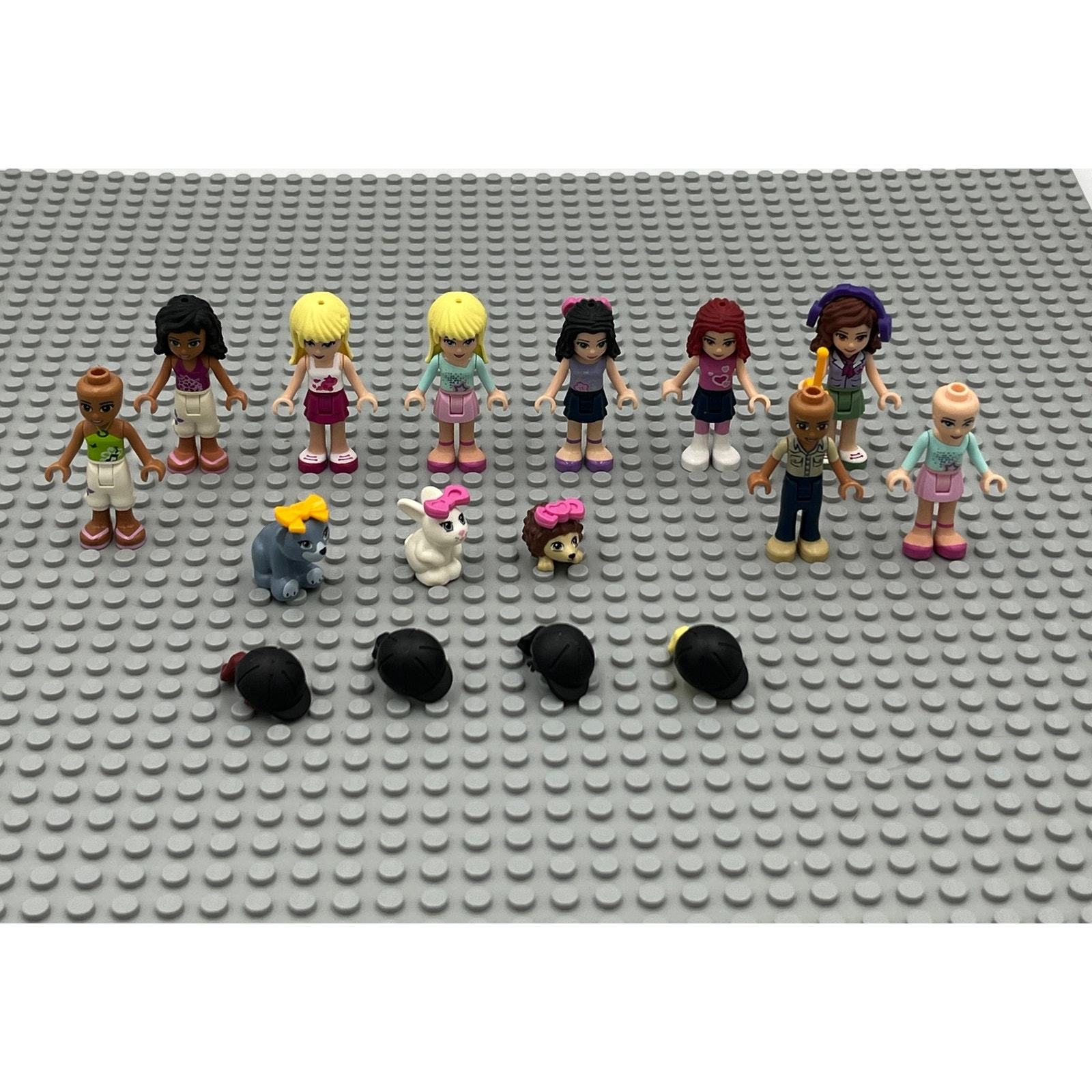 Lego Friends Minifigures lot. Comes with 9 girls. A few don't have their original hair. Including 4 extra hair pieces that have riding hats on them and 3 small animals.