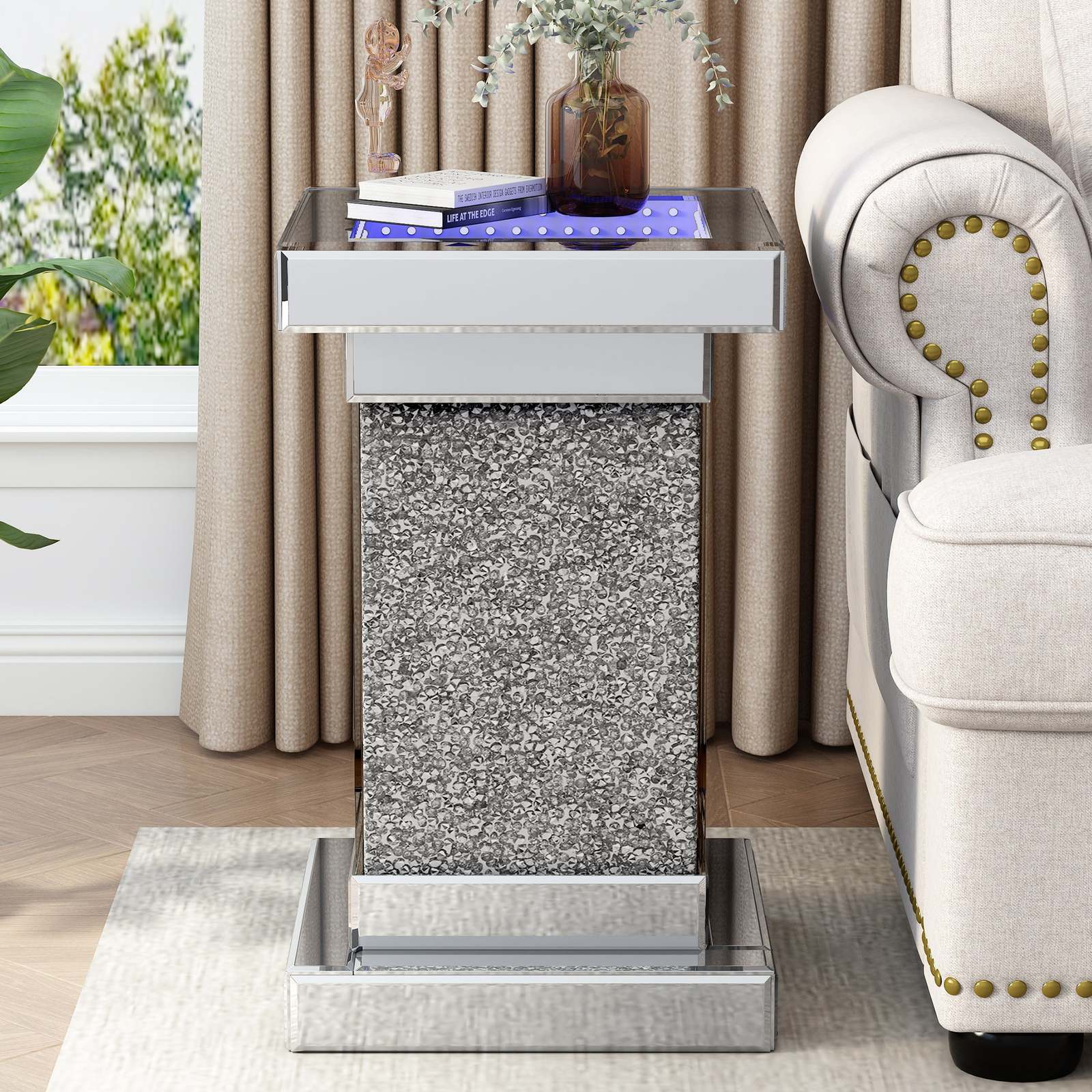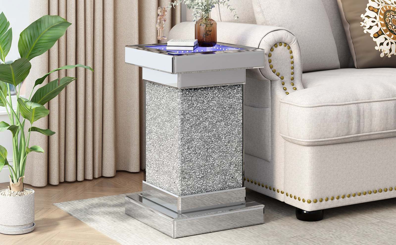 Silver Mirrored End Table w/ LED, Crushed Diamond Side Table Modern Living Room