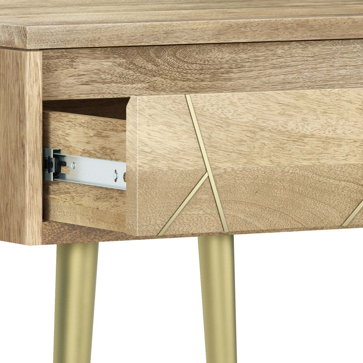 Features one soft close drawer with metal drawer glides for plenty of storage and four gold finished metal legs