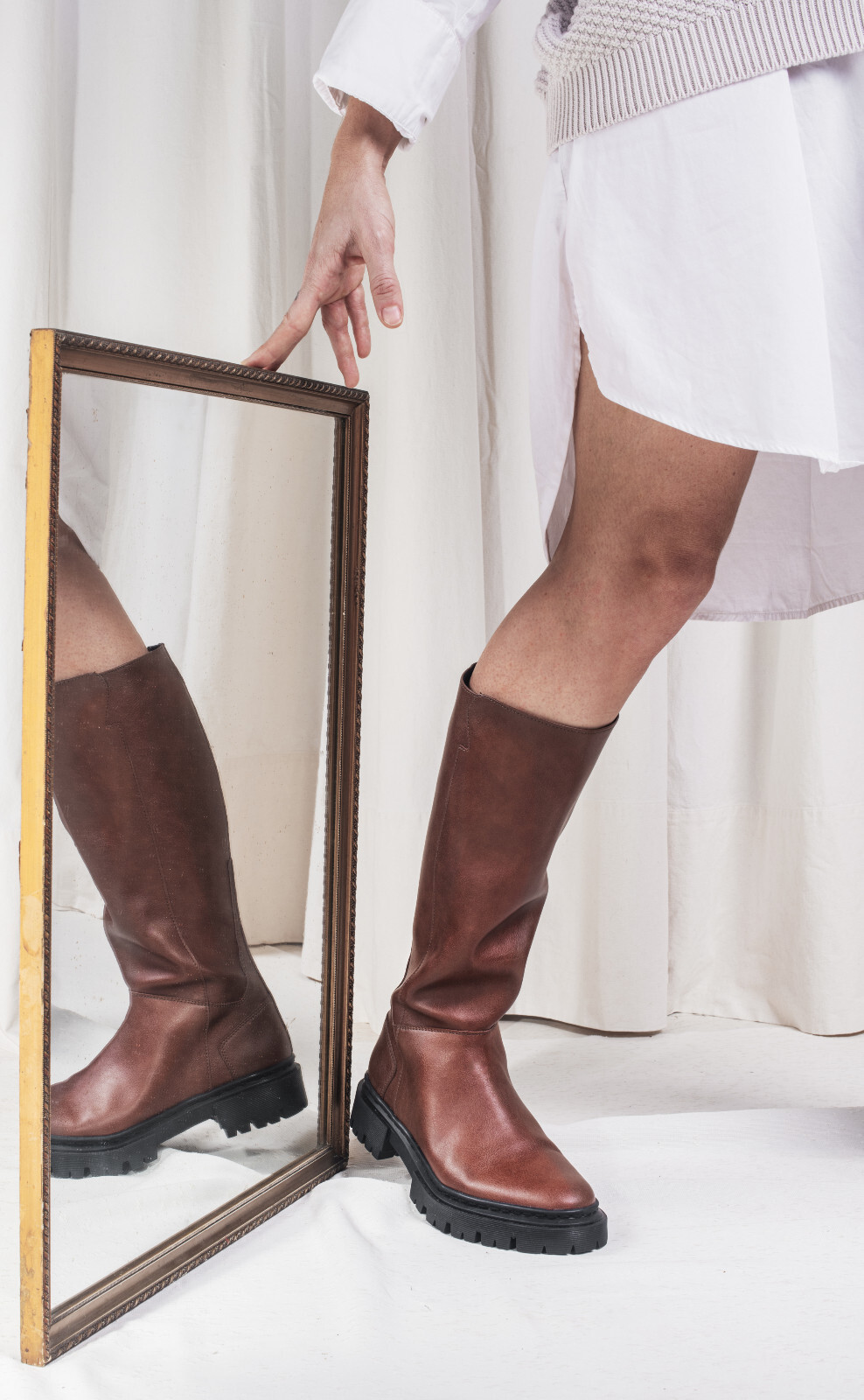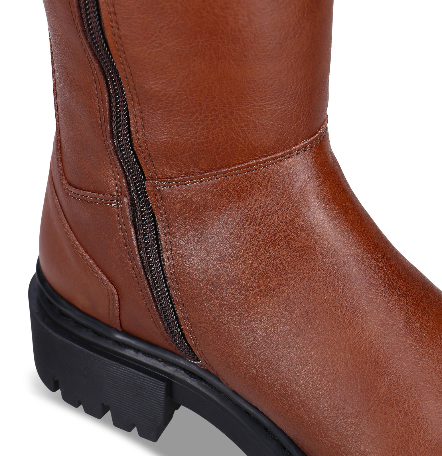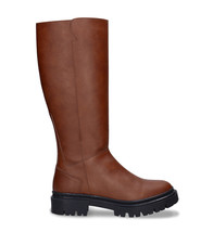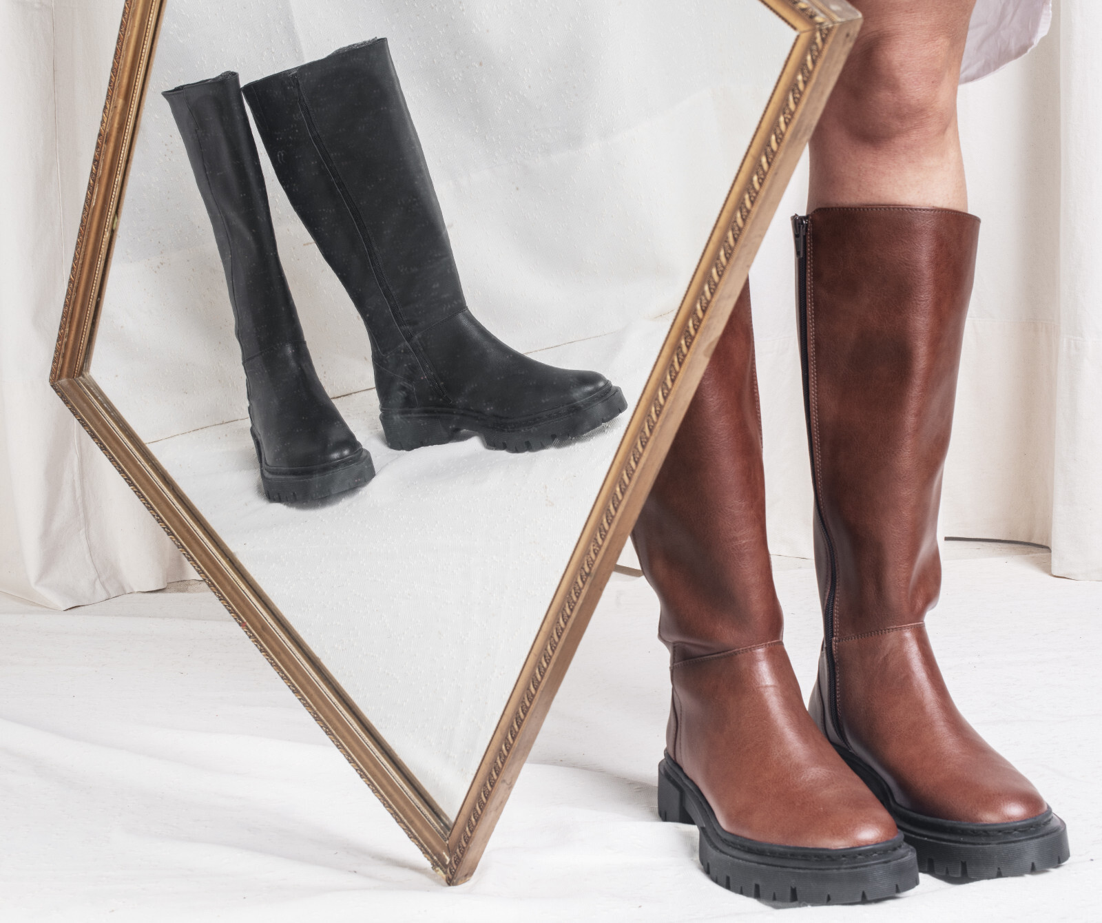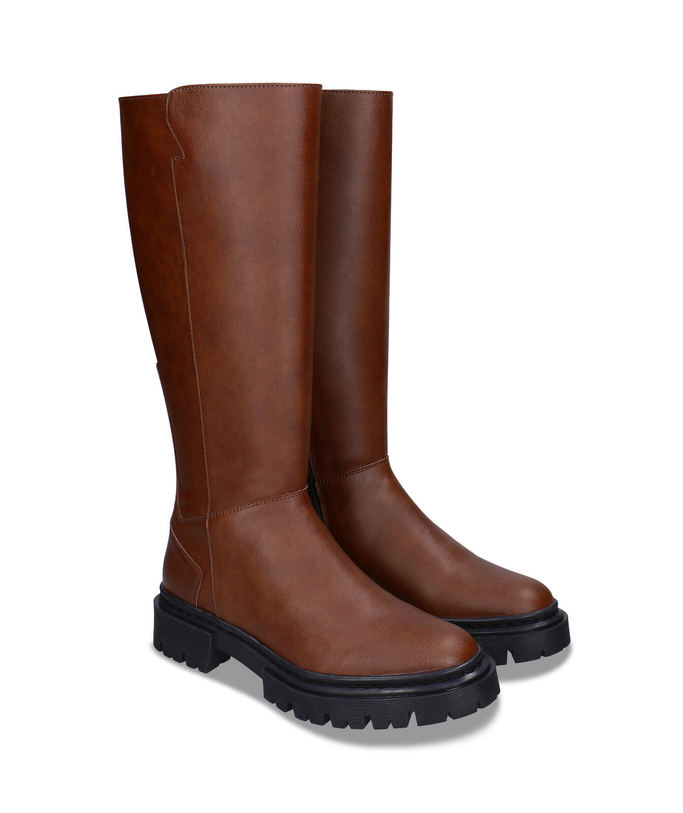 Botas de mujer altas por la rodilla en cuero vegano marrón planas con cremallera