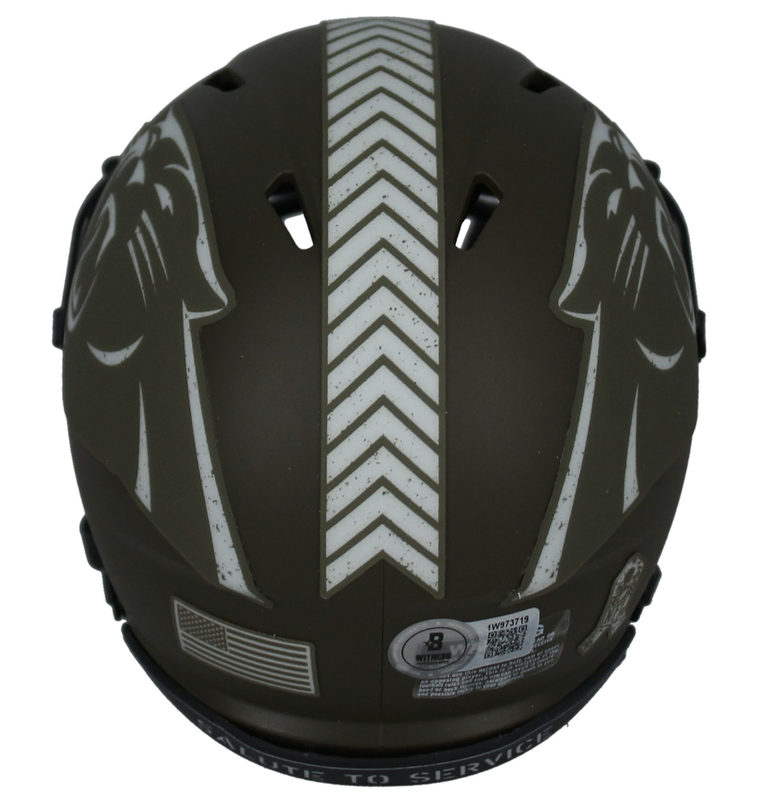 This Carolina Panthers mini speed helmet has been personally hand-signed by Julius Peppers. It comes with an individually numbered, tamper-evident hologram from Beckett Authentic. To ensure authenticity, the hologram can be reviewed online. This process helps to ensure that the product purchased is authentic and eliminates any possibility of duplication or fraud.