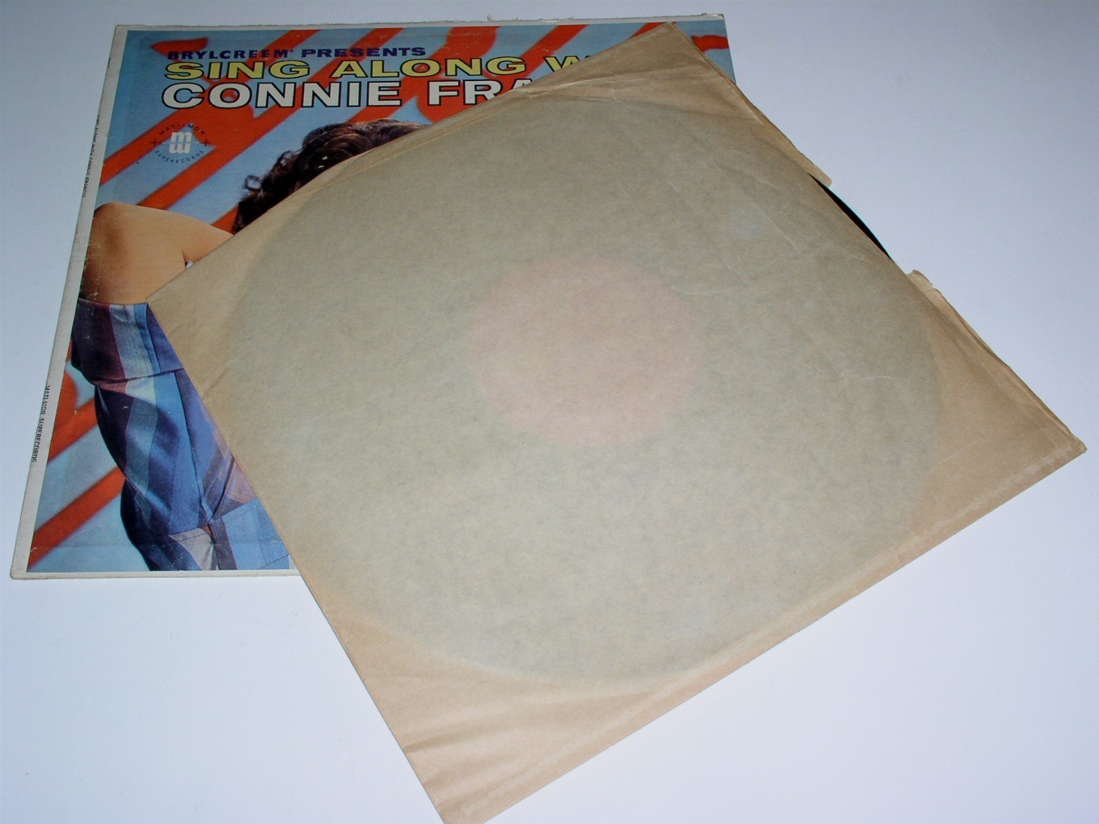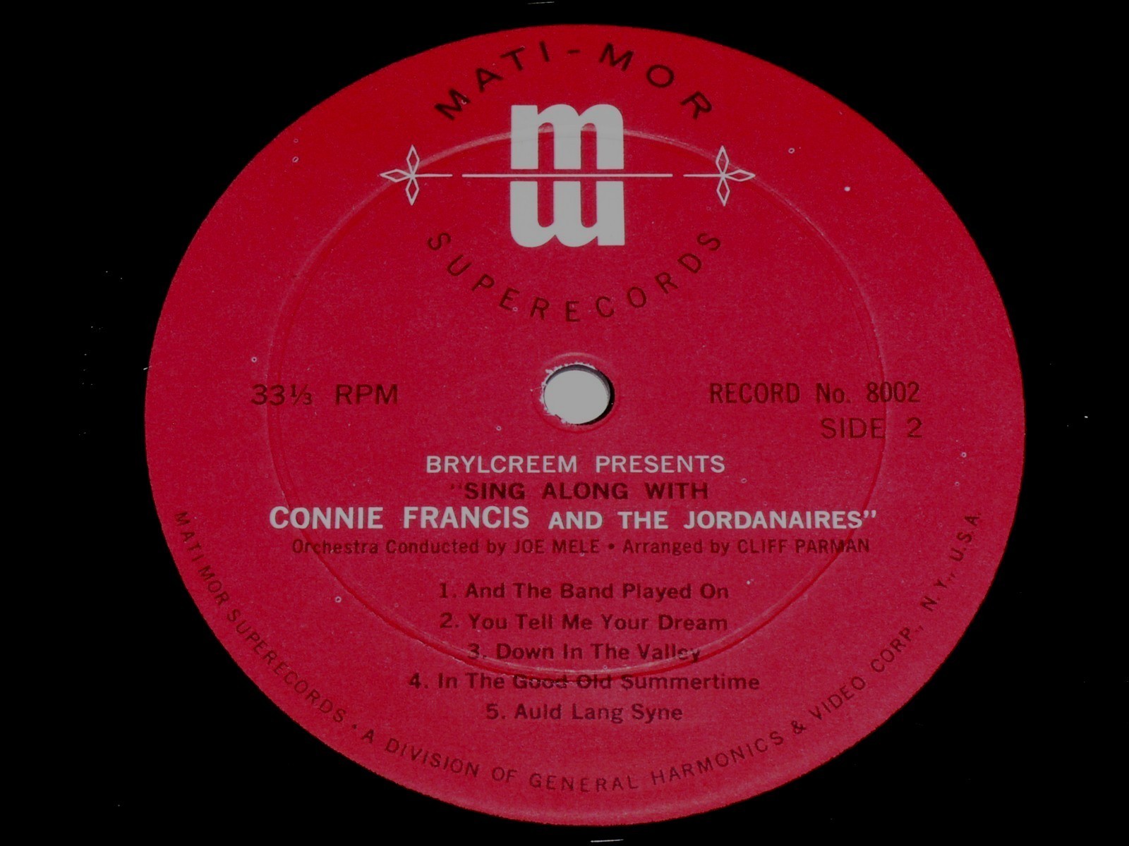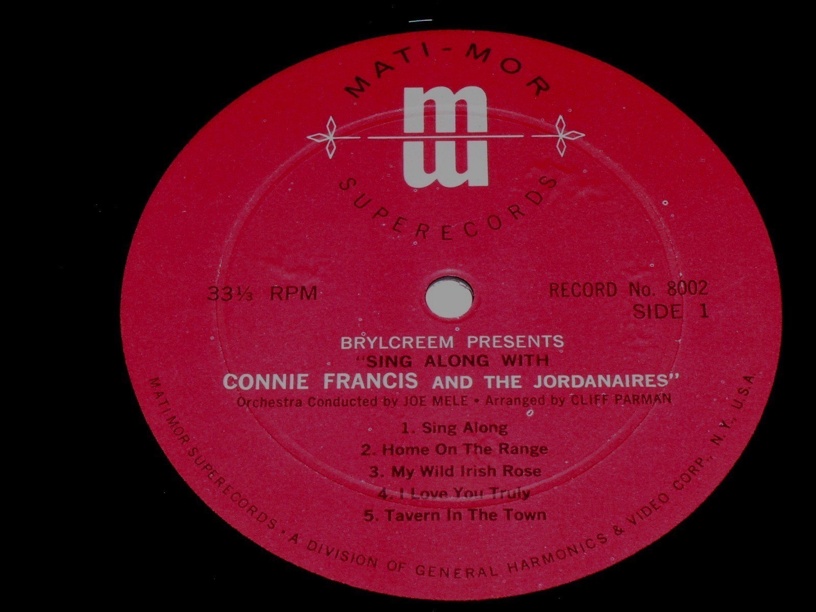 This is a vintage phonograph record album by Connie Francis, entitled, "Brylcreem Presents Sing Along With Connie Francis". Record label: MGM 8002 (Mono).