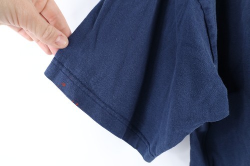 Bleach stains front top and bottom. Graphics cracking. Color faded. USA made