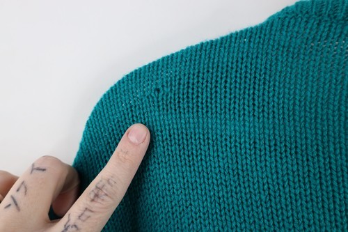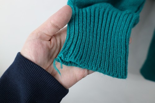 Loose threads front left, right armpit/cuff. Hole back top left. Color faded. Pilling