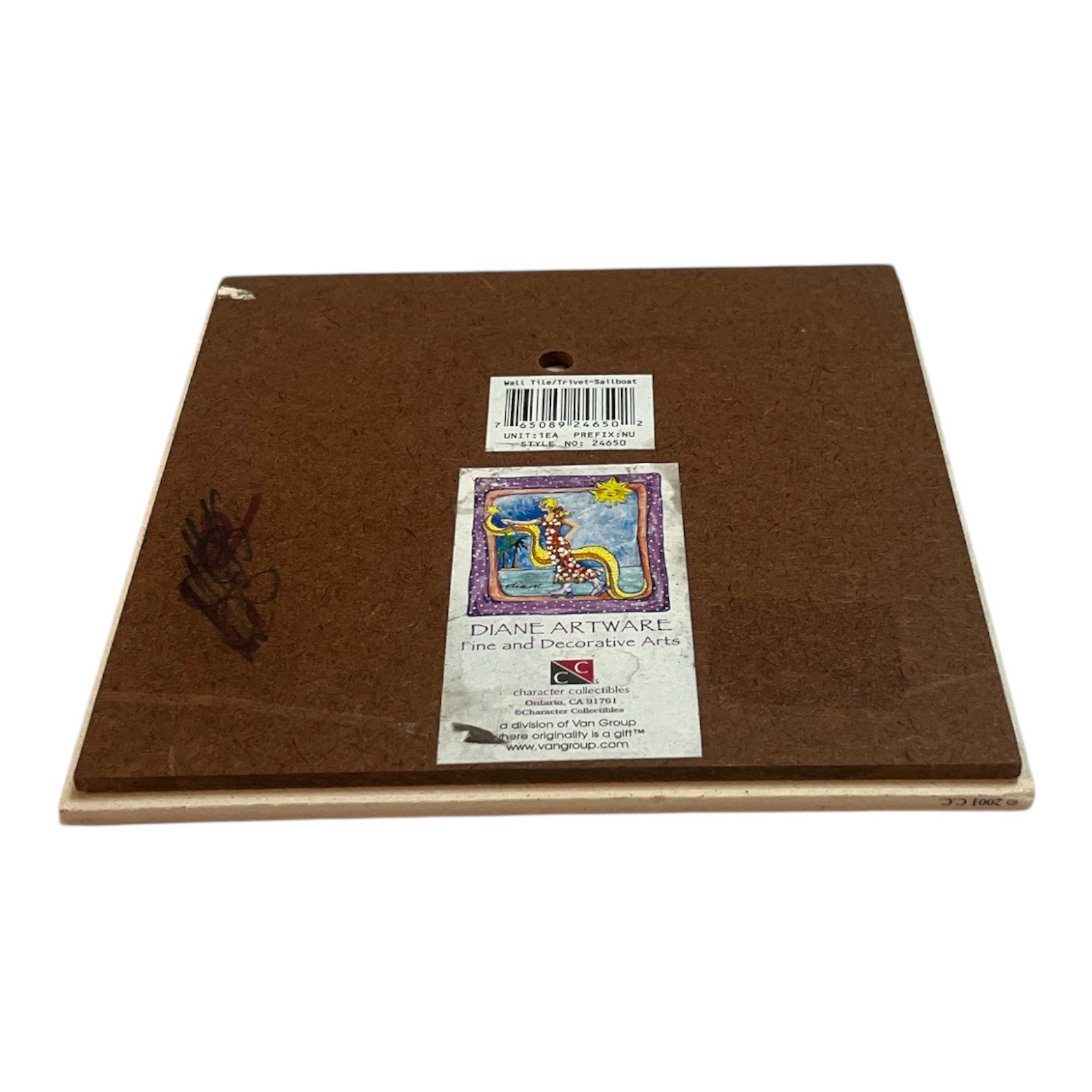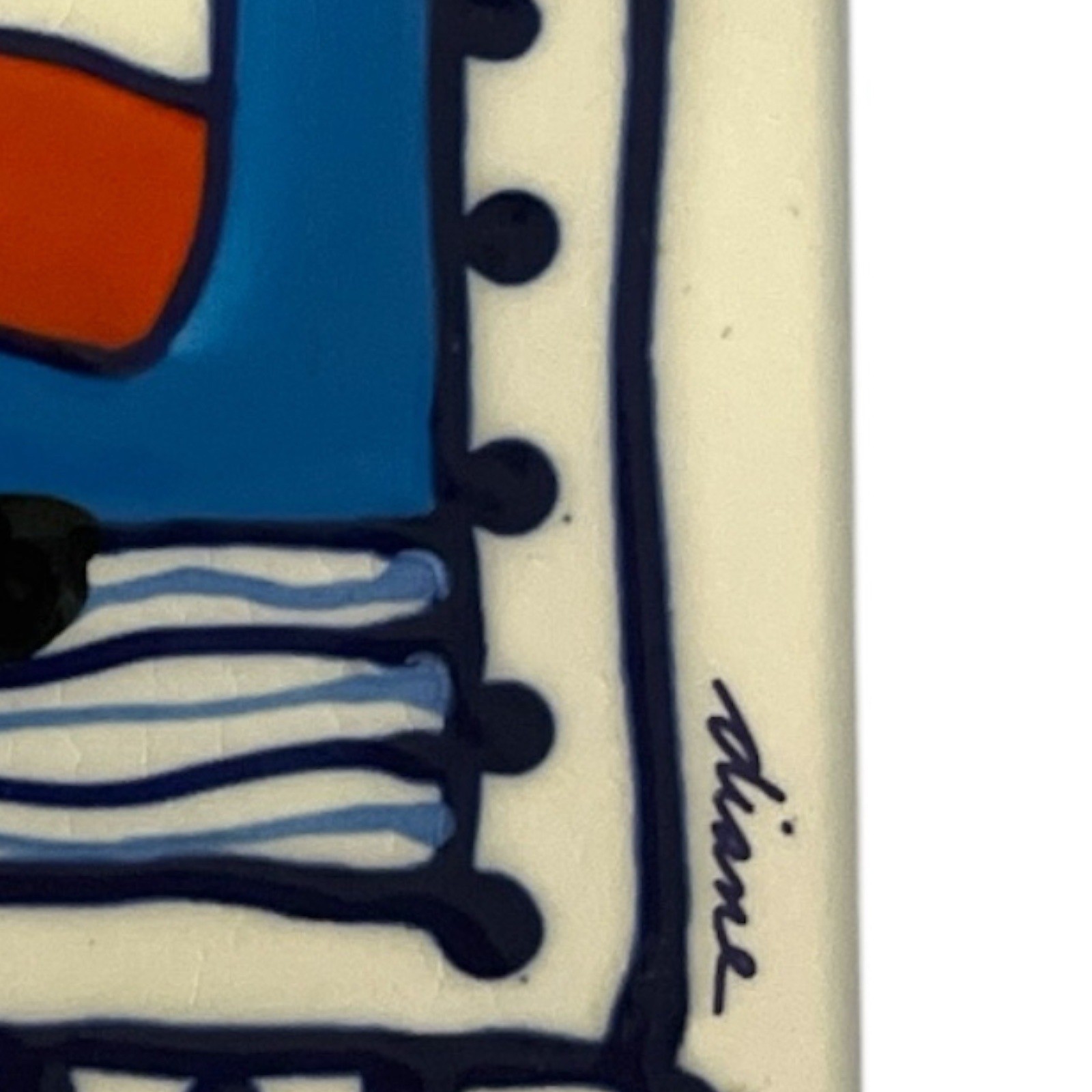 Brighten up your coastal decor with this colorful wall tile or trivet by Diane Artware. Measuring 6 inches square, this ceramic piece features a whimsical handpainted sailboat scene with bold blue, orange, and yellow accents, outlined in black for a fun, modern look. It?s signed ?Diane? on the front and retains its original backing, barcode, and Character Collectibles label.