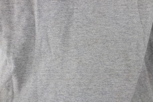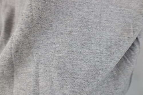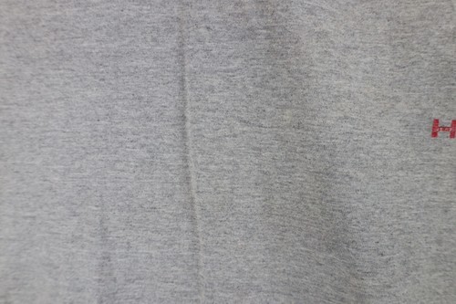 Blemishes collar. Stains front, dark spots throughout. Collar, arms discolored. Color faded. Pilling