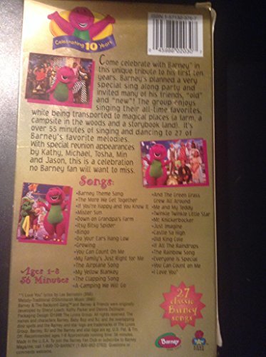 Product description: For those who can't get enough of those Barney songs, here's a made-for-video show packed full of song and dance. The story line is oh-so thin as Barney and his friends sing 27 songs in only 56 minutes, so Barney is usually singing or introducing a new song. For anyone who has been watching the decade that Barney has been on the airwaves, most of the songs are Barney standards: "Mr. Sun," "The Airplane Song," "Baby Bop Hop," and "I Love You." They are mixed in with all-time favorites "Itsy Bitsy Spider," "A Camping We Will Go," and the like. Many of Barney's original kid friends return looking much older and wiser. No big landmark production here, just a "greatest hits" of Barney tunes that should have fans singing and dancing around the tube for nearly an hour.