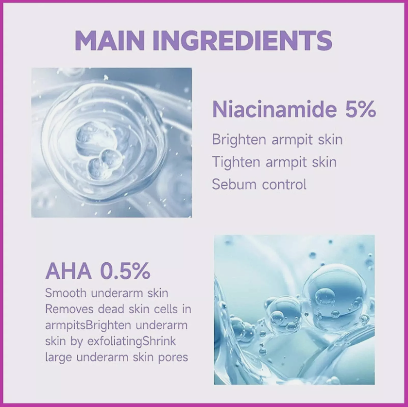 2. Brightening Elegance: Niacinamide visibly brightens and revitalizes armpit skin for a radiant glow.