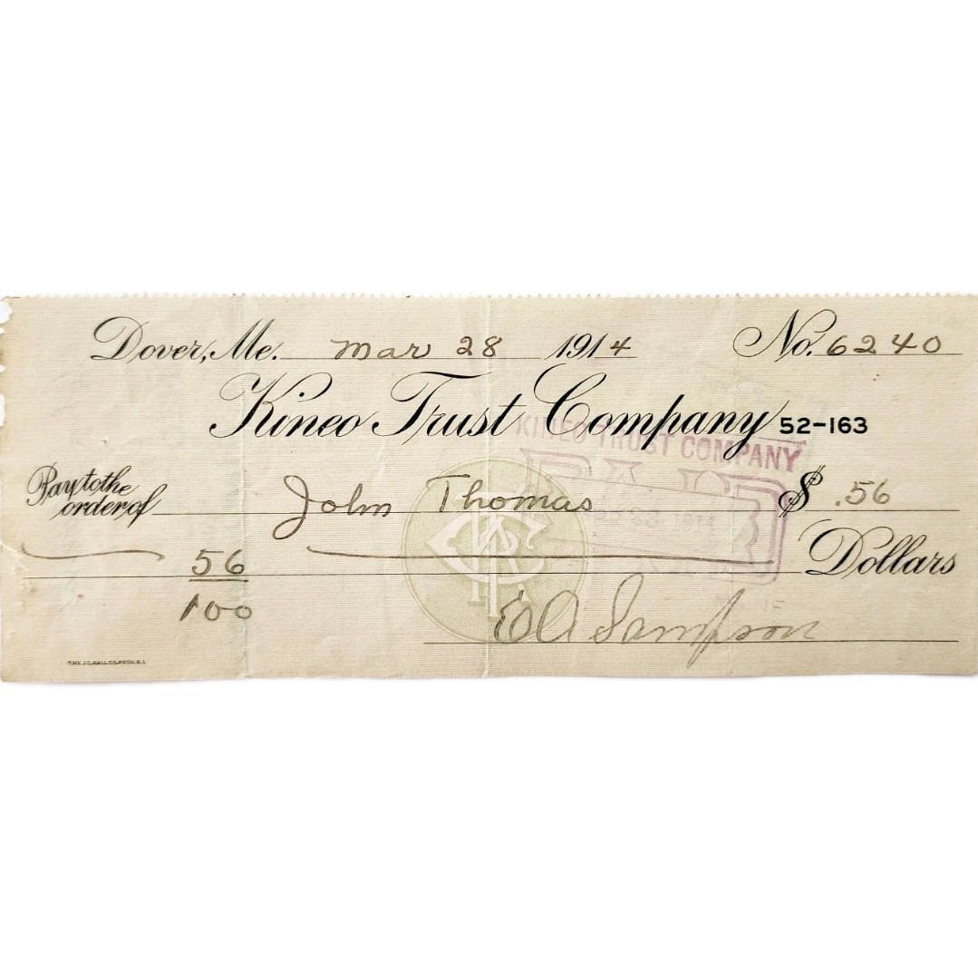 1914 Kineo Trust Company Bank Check E.A. Sampson Dover Maine Signed 6240 CHX12