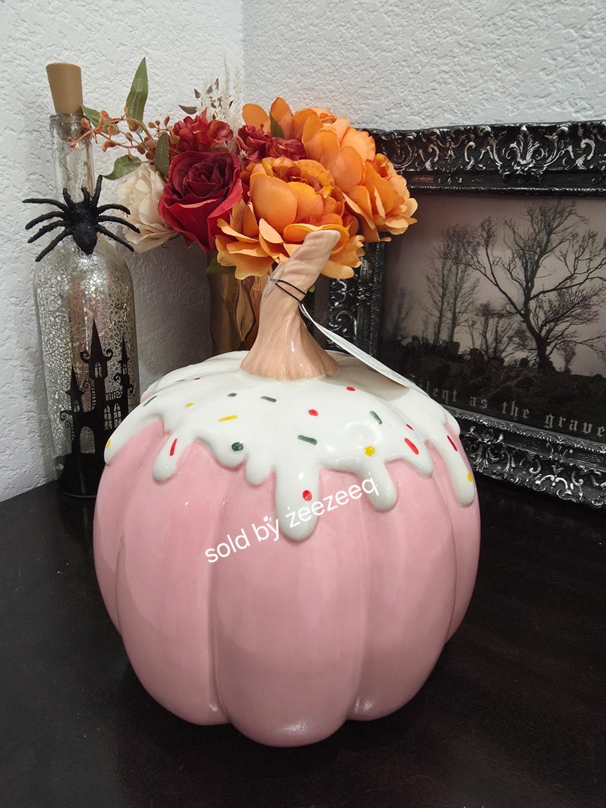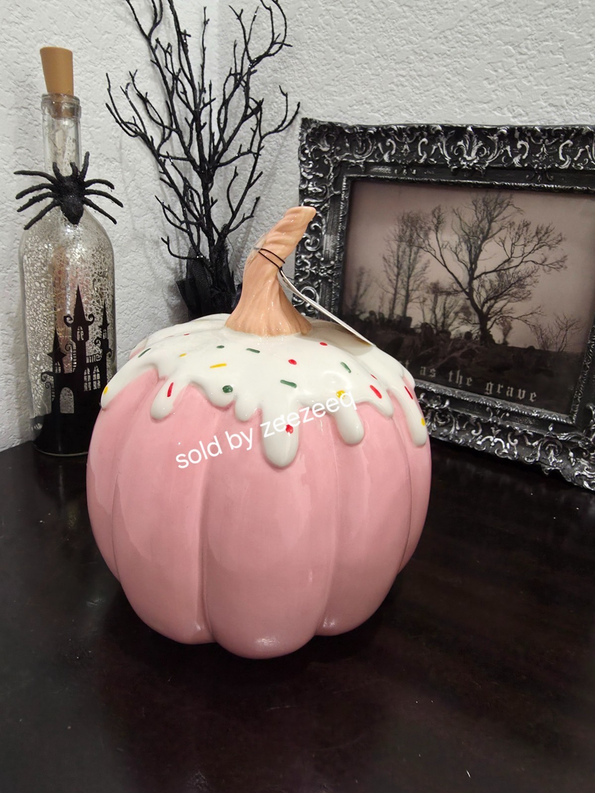 Up for sale we have this gorgeous pink ceramic pumpkin for your Thanksgiving/Fall or Halloween decor. The pumpkin has sprinkles and made of ceramic. It measures approx 9" tall. NEW Sooo pretty!