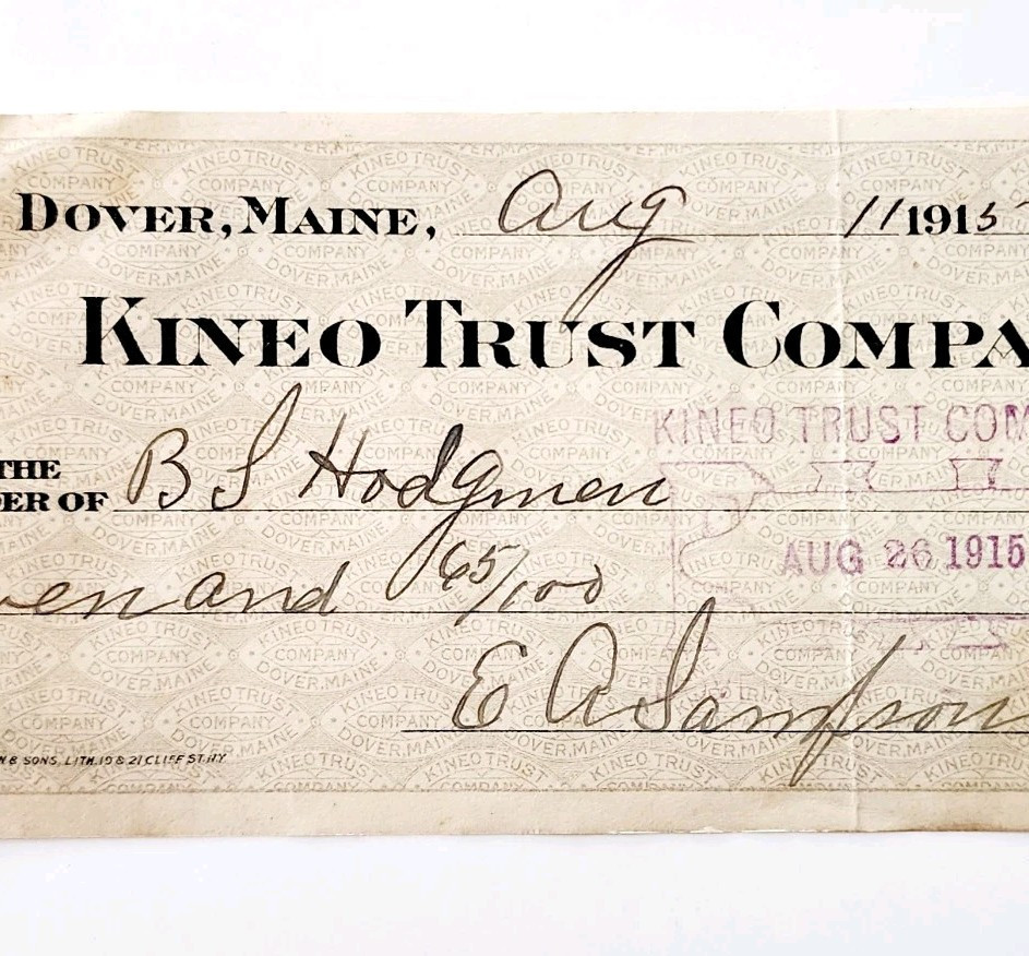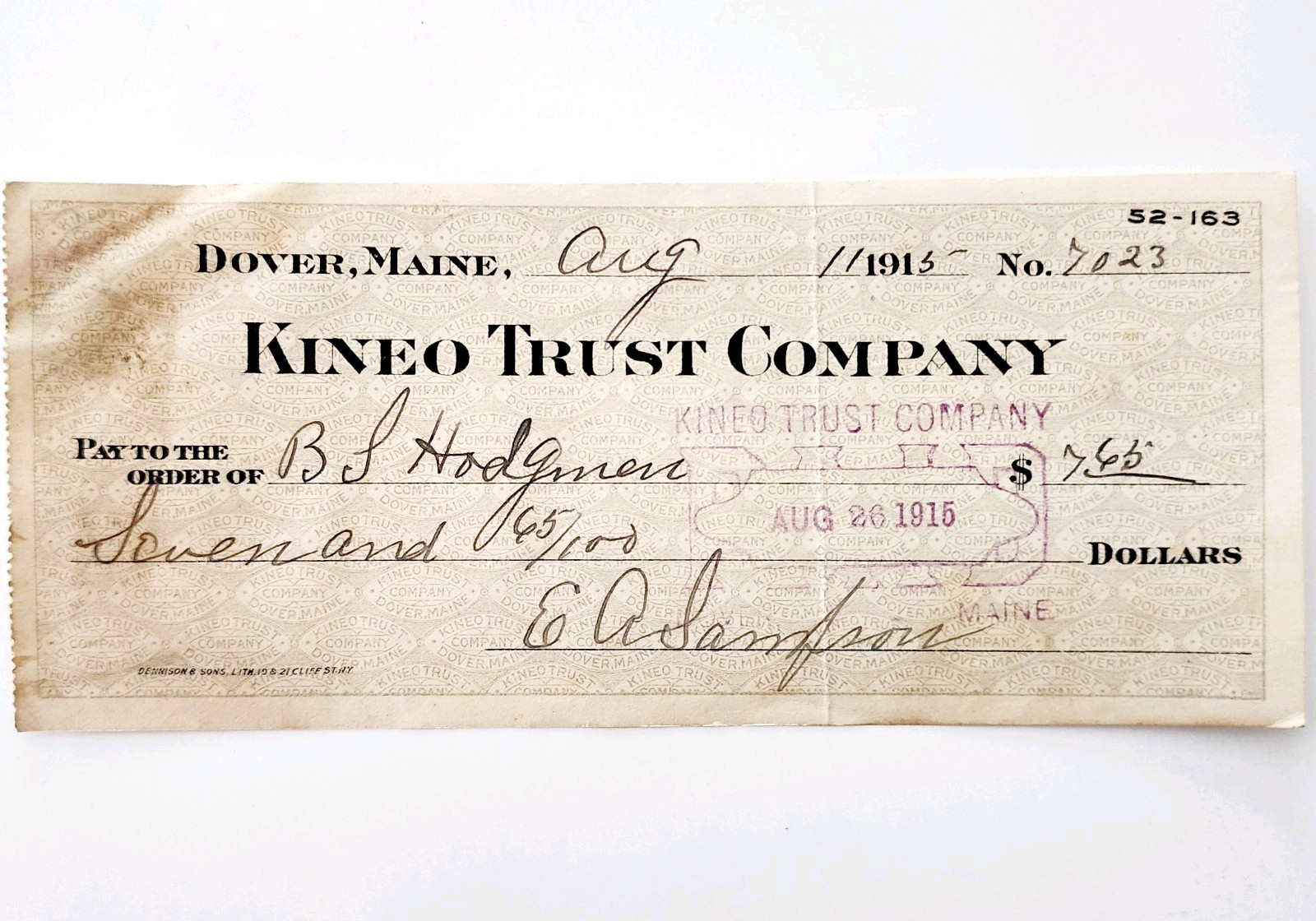 1915 Kineo Trust Company Bank Check E.A. Sampson Dover Maine Signed 7023 CHX14