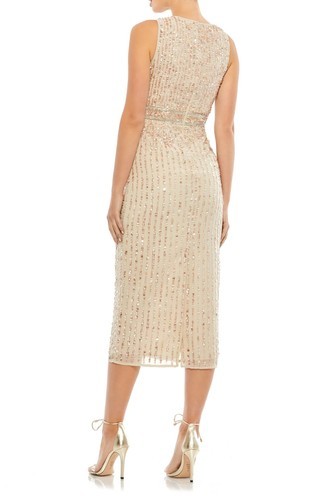 Sleeveless v-neck midi dress embellished with vertically-striped sequins and a hand-beaded belt. Midi-length skirt features a center vent slit.