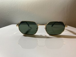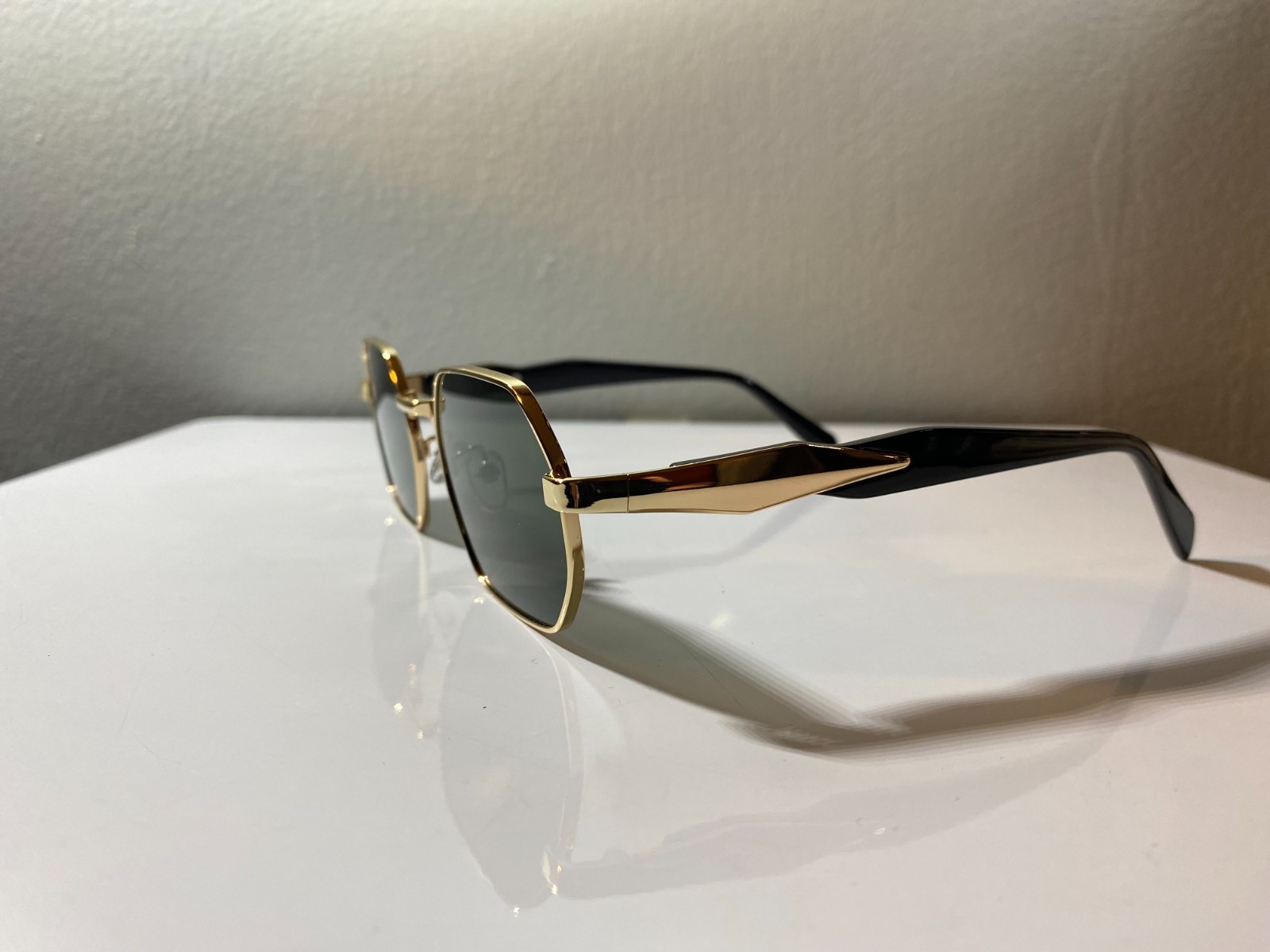 Gold framed, unisex sunglasses with green polygonal lenses and black arms