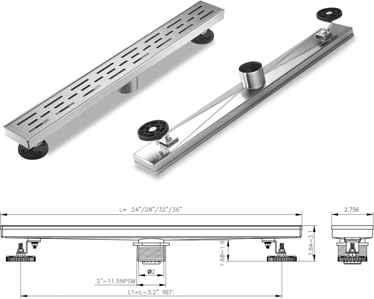 28" Linear Shower Drain, Brushed Nickel Silver - Removable Grate, Leveling Feet