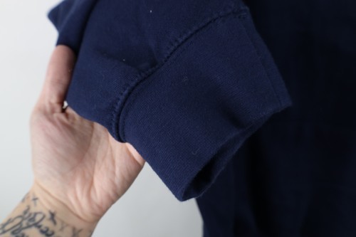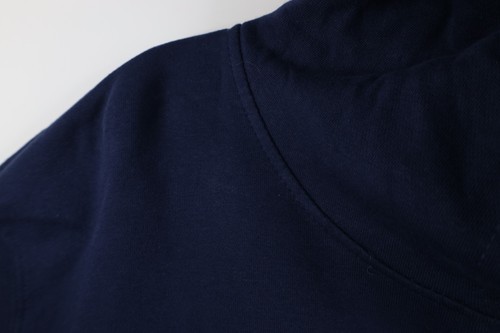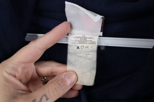 Blemishes front, shoulders, hood. String distressed. Graphics, color faded. Hood, cuffs discolored. Pilling