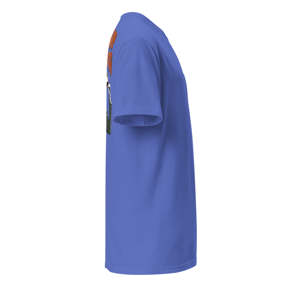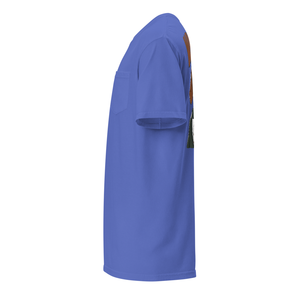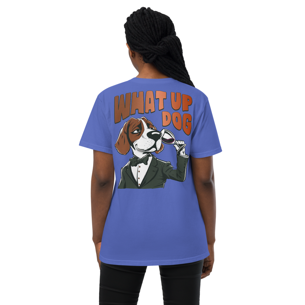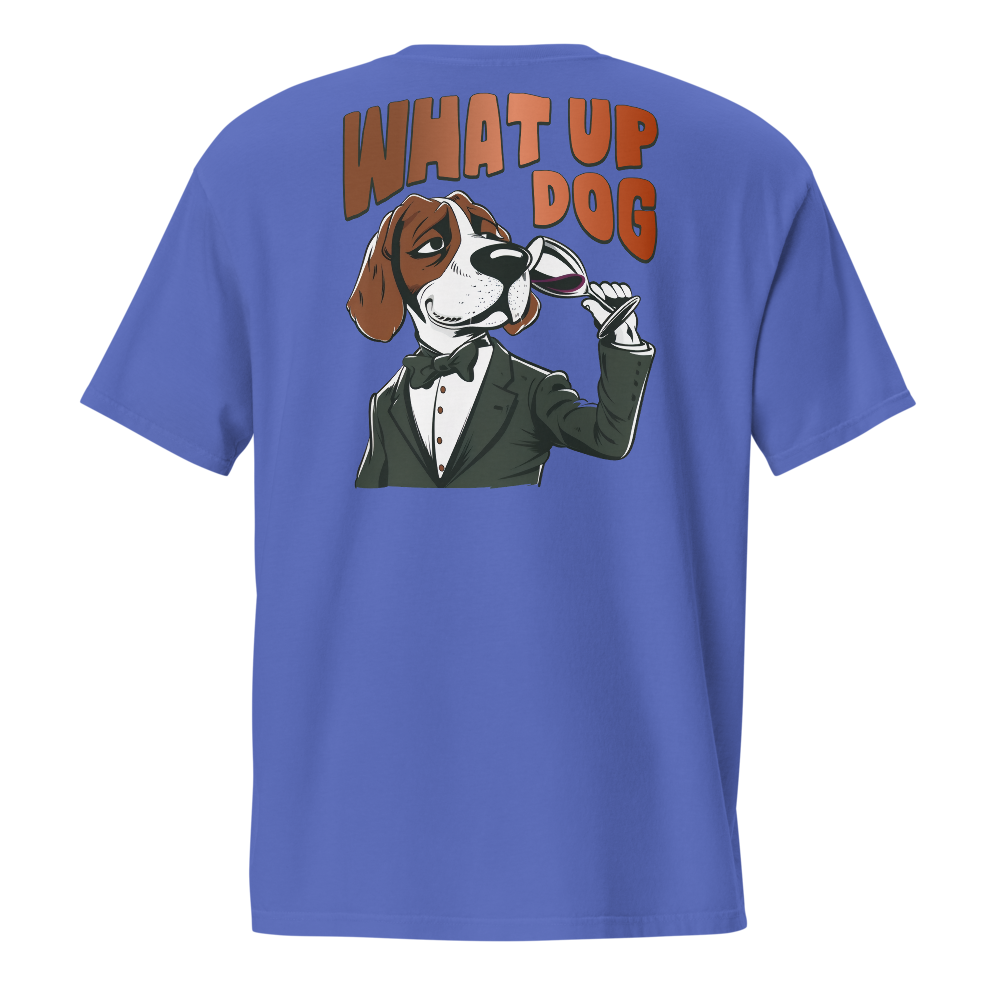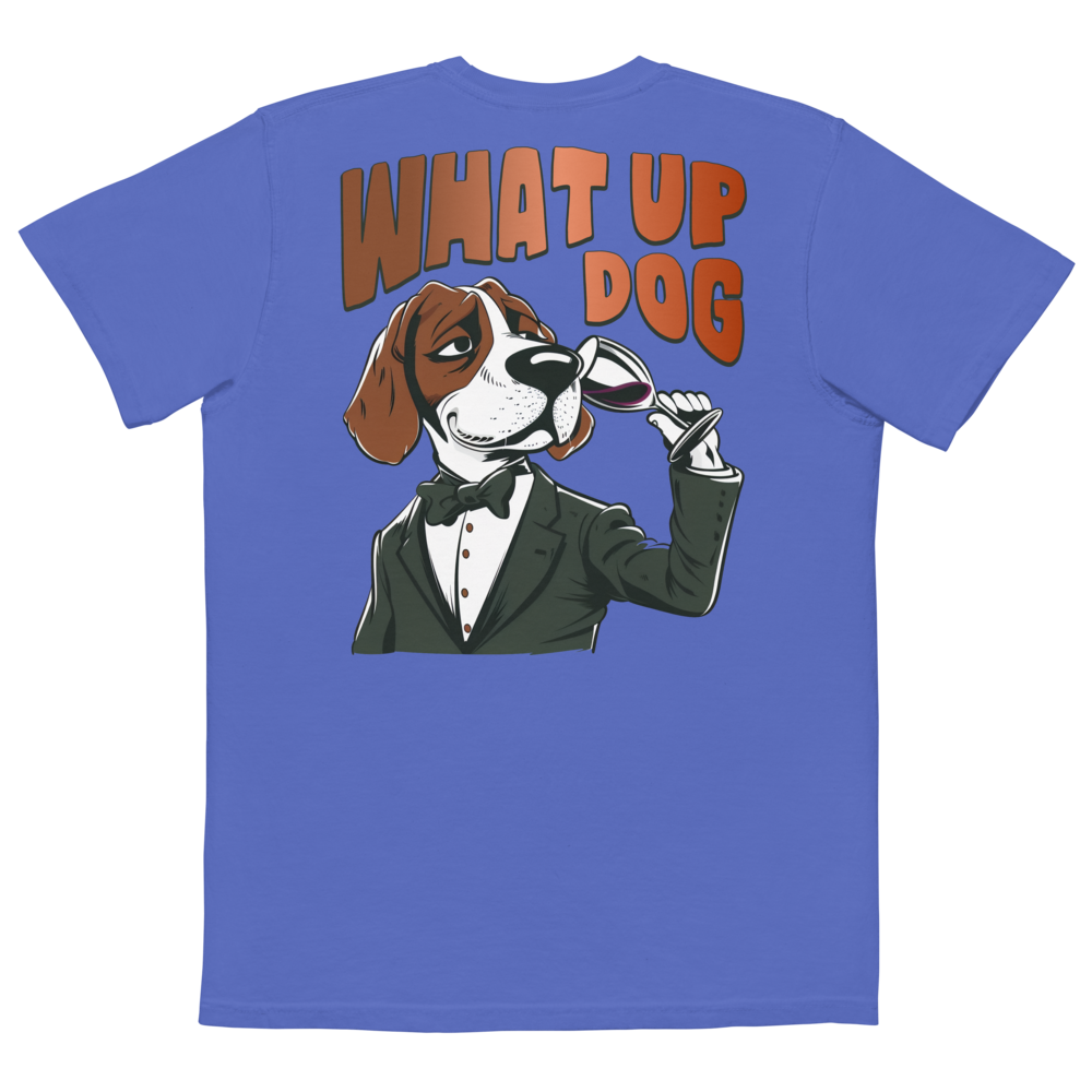 Unisex Garment-Dyed Pocket T-Shirt – What Up Dog Back Print (Flo Blue)