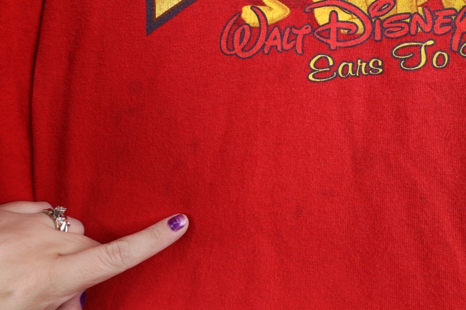 โStains front middle, back bottom. Graphics faded. Color fadedโ |
