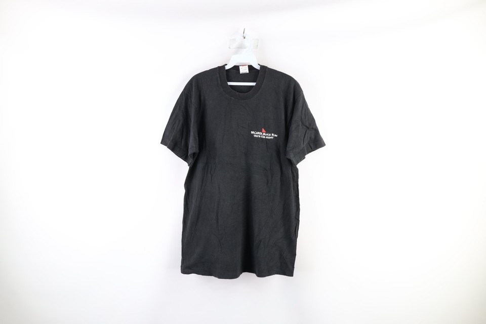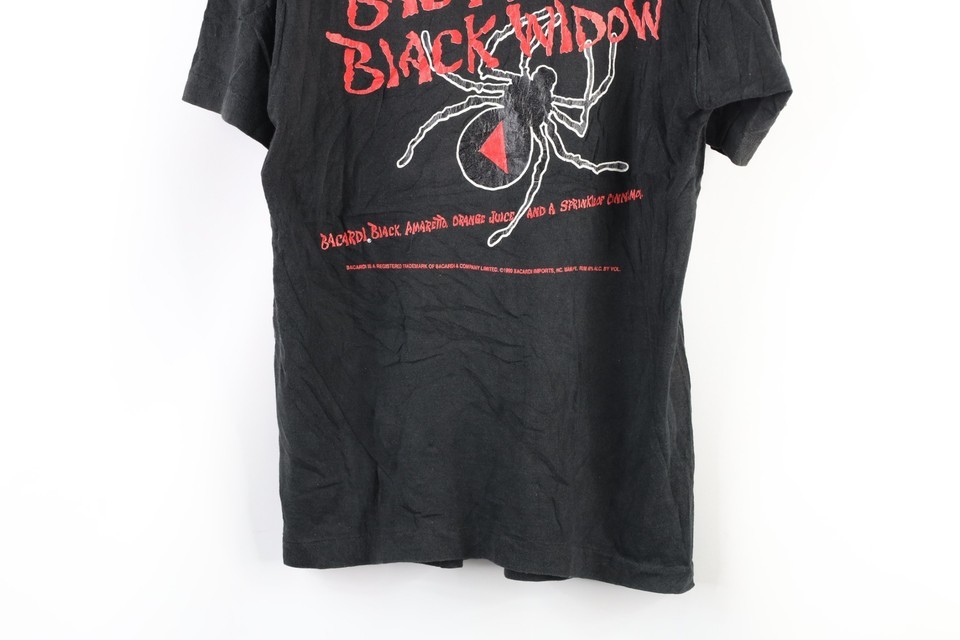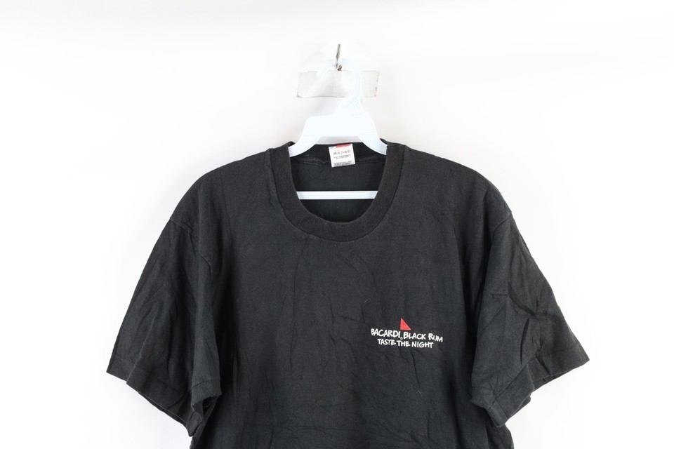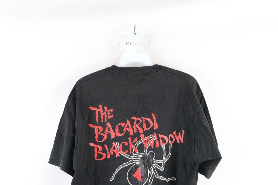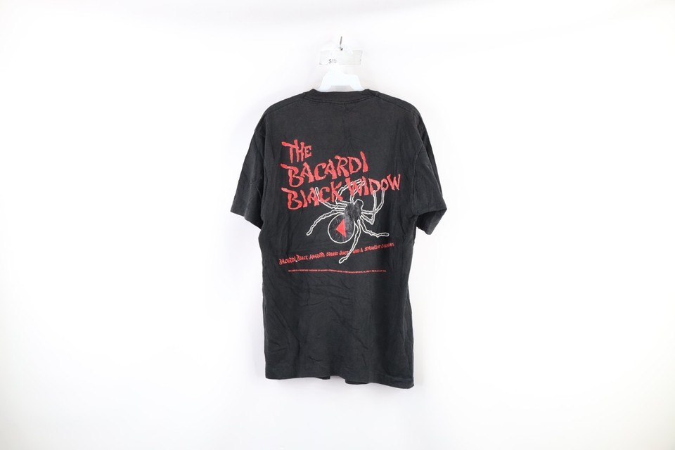 Vtg 90s Mens Large Faded Spell Out Bacardi Black Rum Spider T-Shirt Black USA