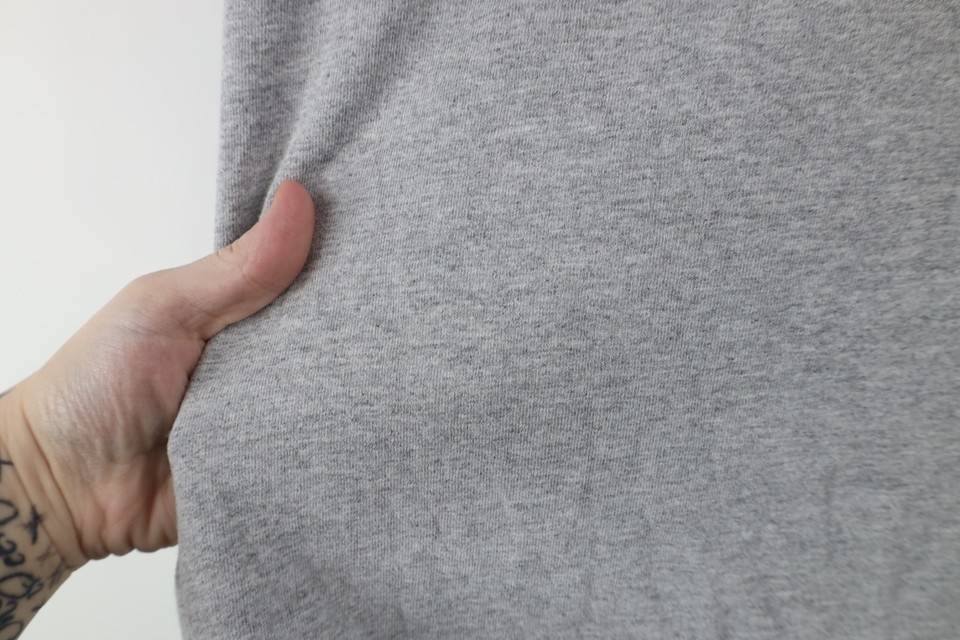 Dark spots front. Collar, armpits discolored. Design distressed. Color faded. Pilling. Made in USA