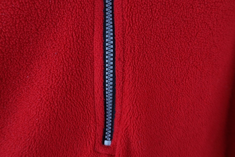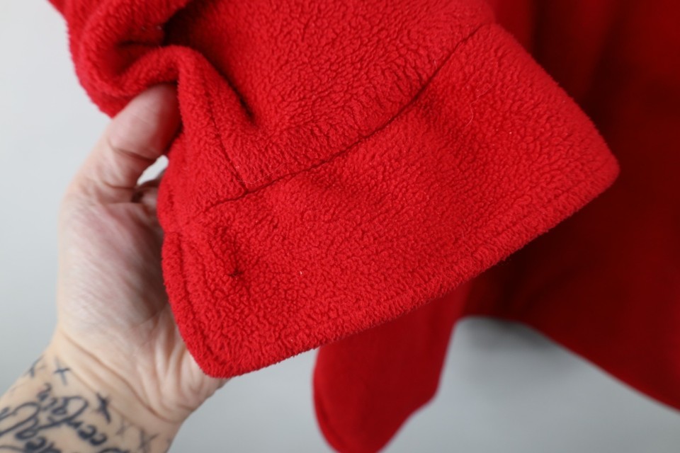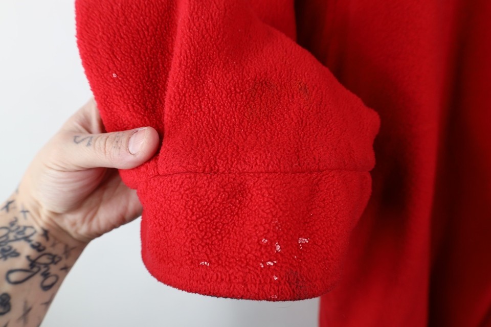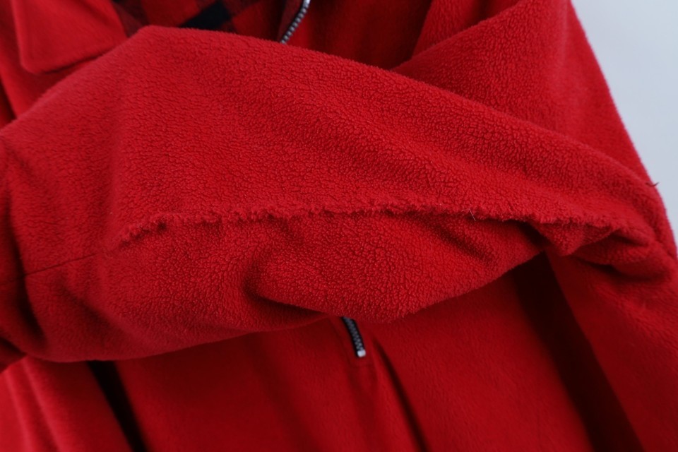Reversible. Checkered side: Hole right arm. Loose threads front. Stains arms/cuffs, back. Red side: Mended Hole left arm. Stains right arm/cuff, front. Patches distressed. Loose threads front. Missing buttons both cuffs. Fleece matted, pilling. Color faded