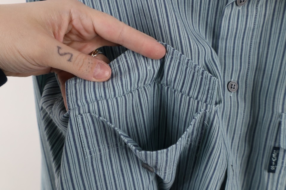 Pilling, fabric pulls. Collar, cuffs discolored. Color faded. Pilling