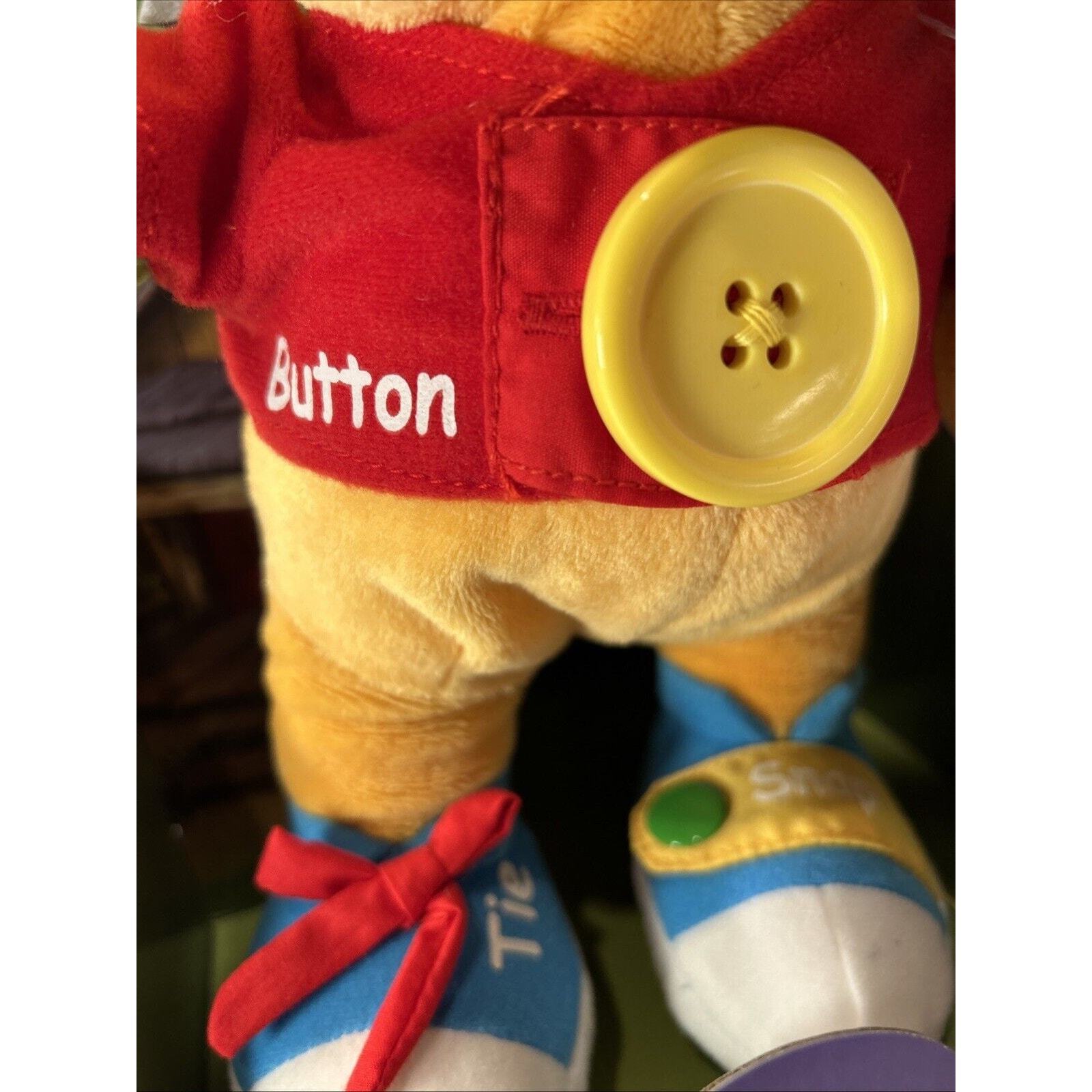 Winnie The Pooh can help teach your 12m+ old child how to manipulate things common on clothing, by tie and snap his shoes, button his shirt, zip the pocket on his shirt, stick the hook and loop on his watch and buckle his hat.