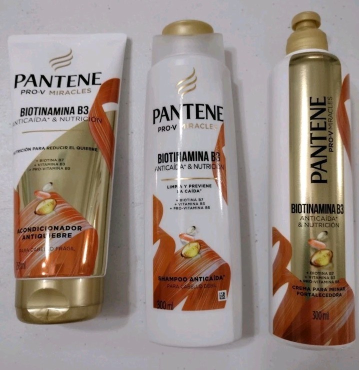 1 bottle of Pantene Biotamine ( Biotinamina ) Shampoo of 300ml , 1 bottle of Pantene Biotamine Conditioner (Acondicionador) of 250ml, and 1 bottle of Pantene Biotamine Hair Cream (crema para cabello) of 300ml