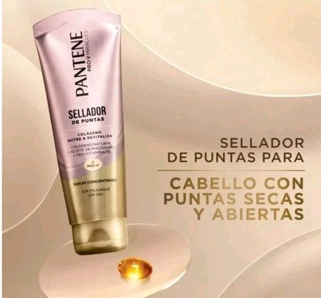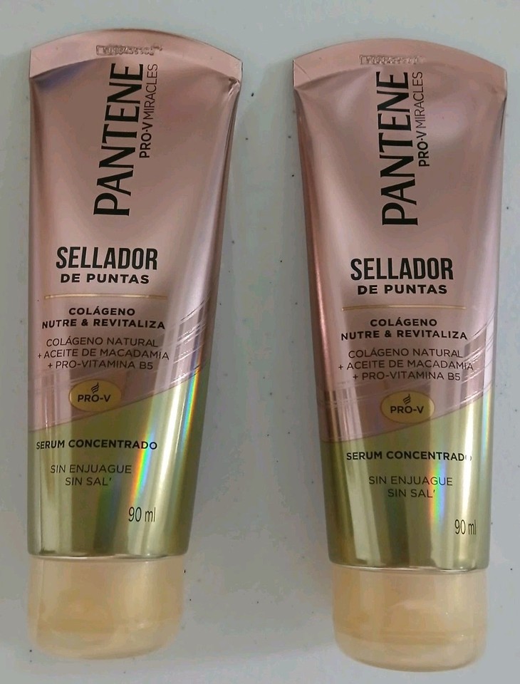The product is a set of 2 Pantene Pro-V Miracles Split Ends Repair (Sellador de Puntas), each with a volume of 90ml. These leave-in creams are designed to nourish and hydrate all hair types, including color-treated and damaged hair. The active ingredients are keratin and silicone, providing essential repair and protection. The cream comes in a white color with a formulation of apple, almond, and cherry scents. It is cruelty-free and has a period after opening of 6 months. Made in Mexico, these products are suitable for both women and men looking to effectively repair split ends and keep their hair healthy and strong.