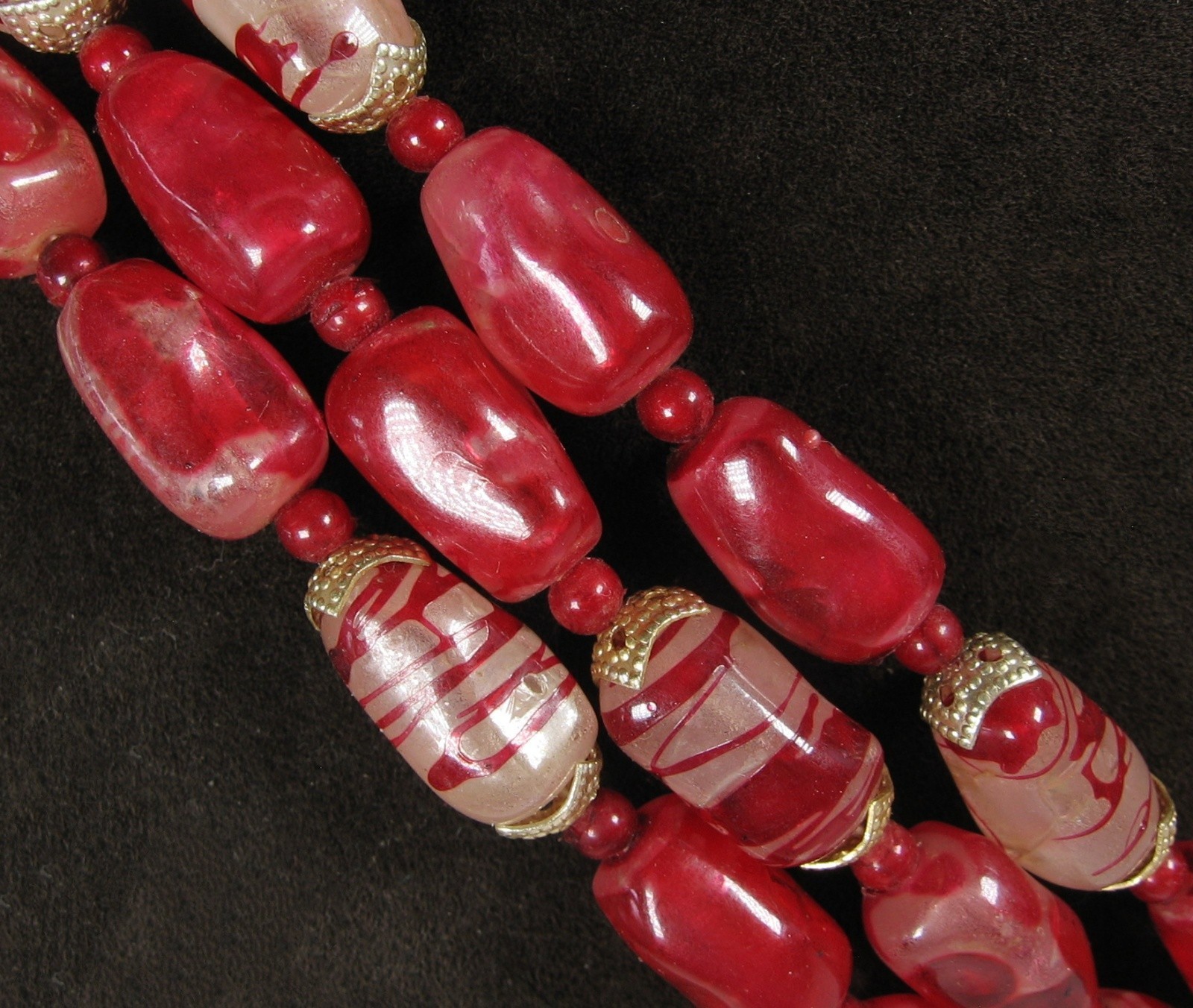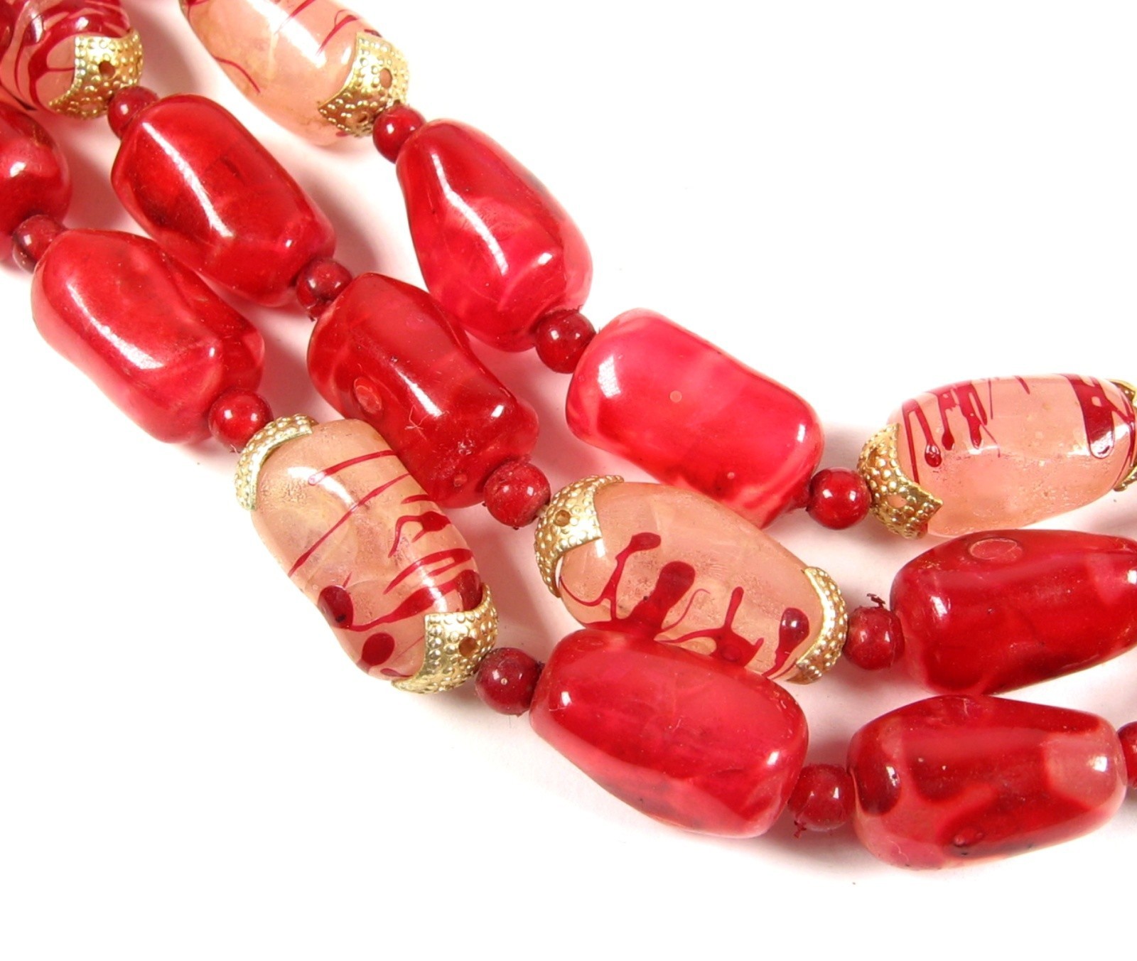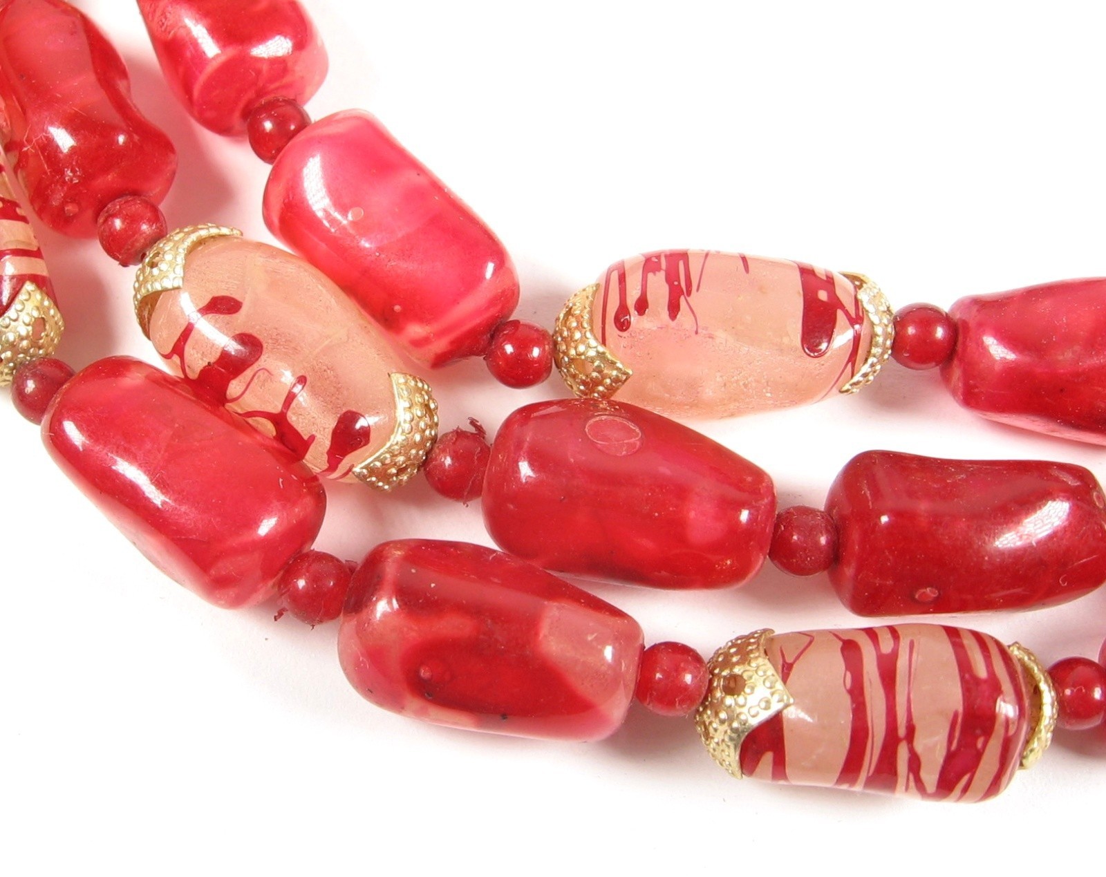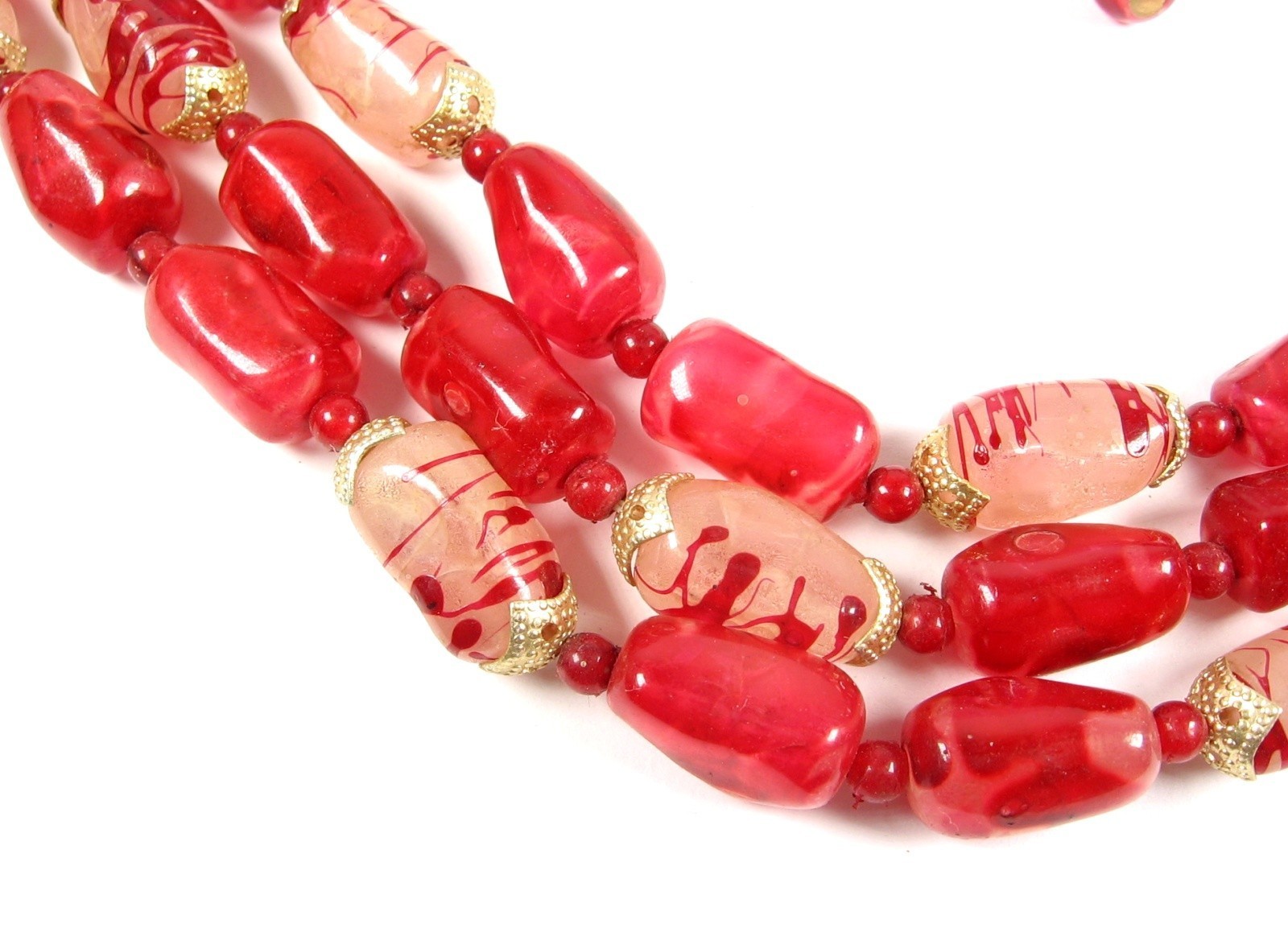 Oblong plastic beads that are in a Marbled Red color are complimented with the Milky Clear with Red Striped beads to give this triple strand beaded necklace an overall Candy Apple Red Look!