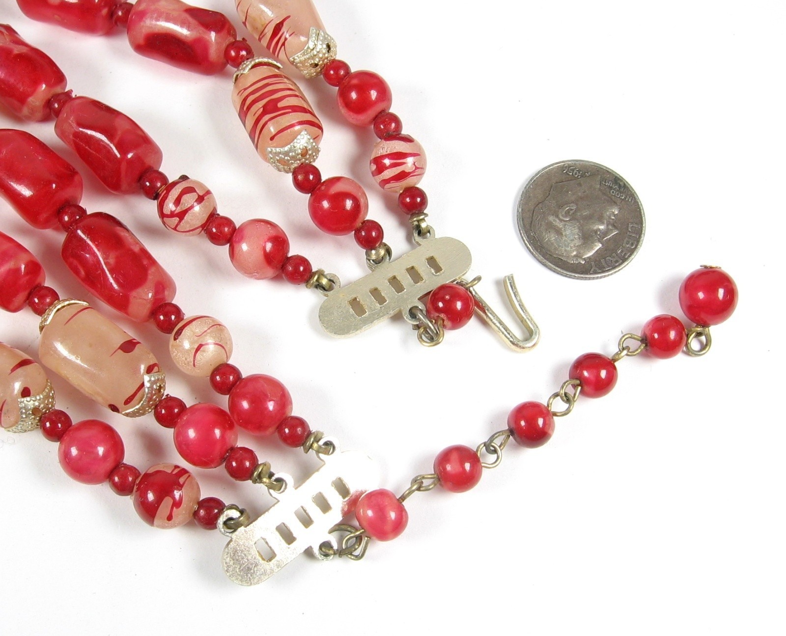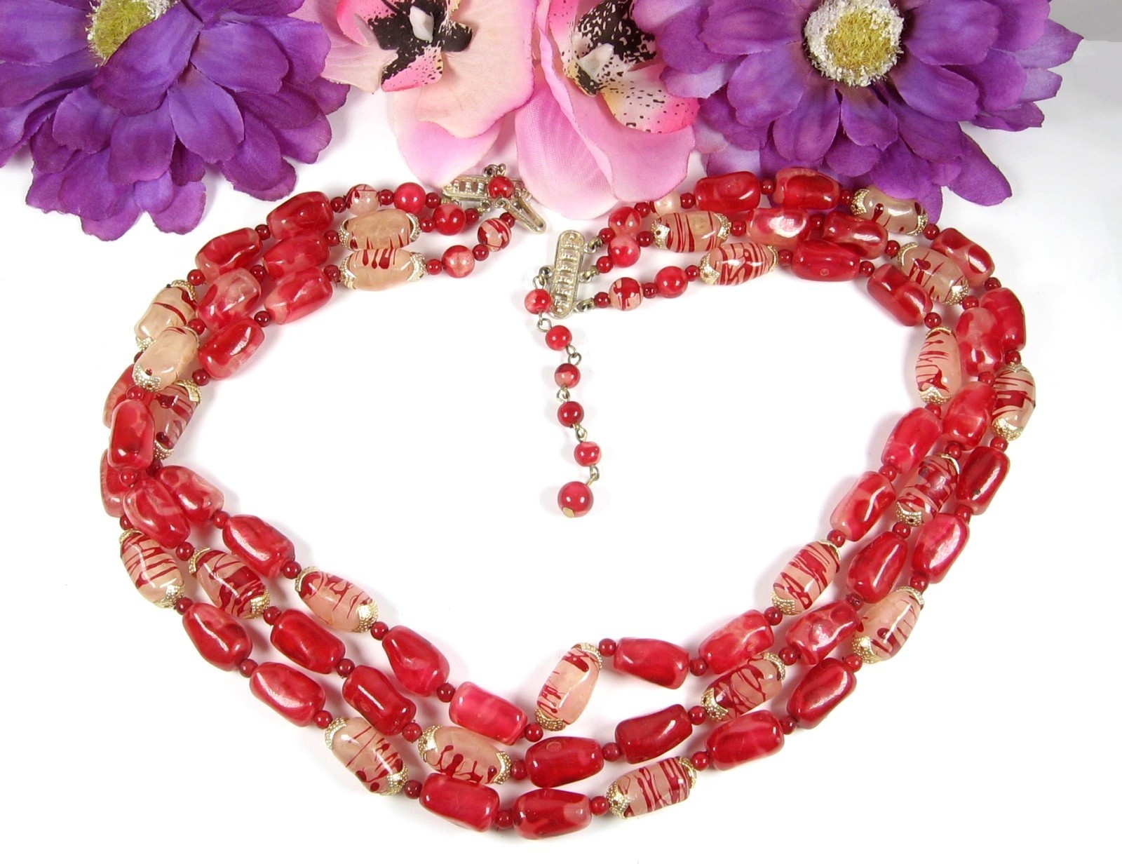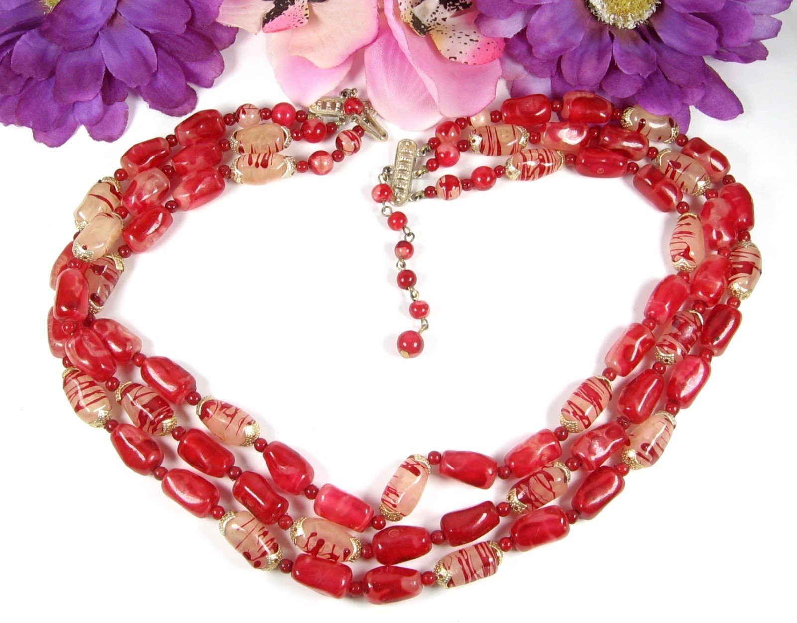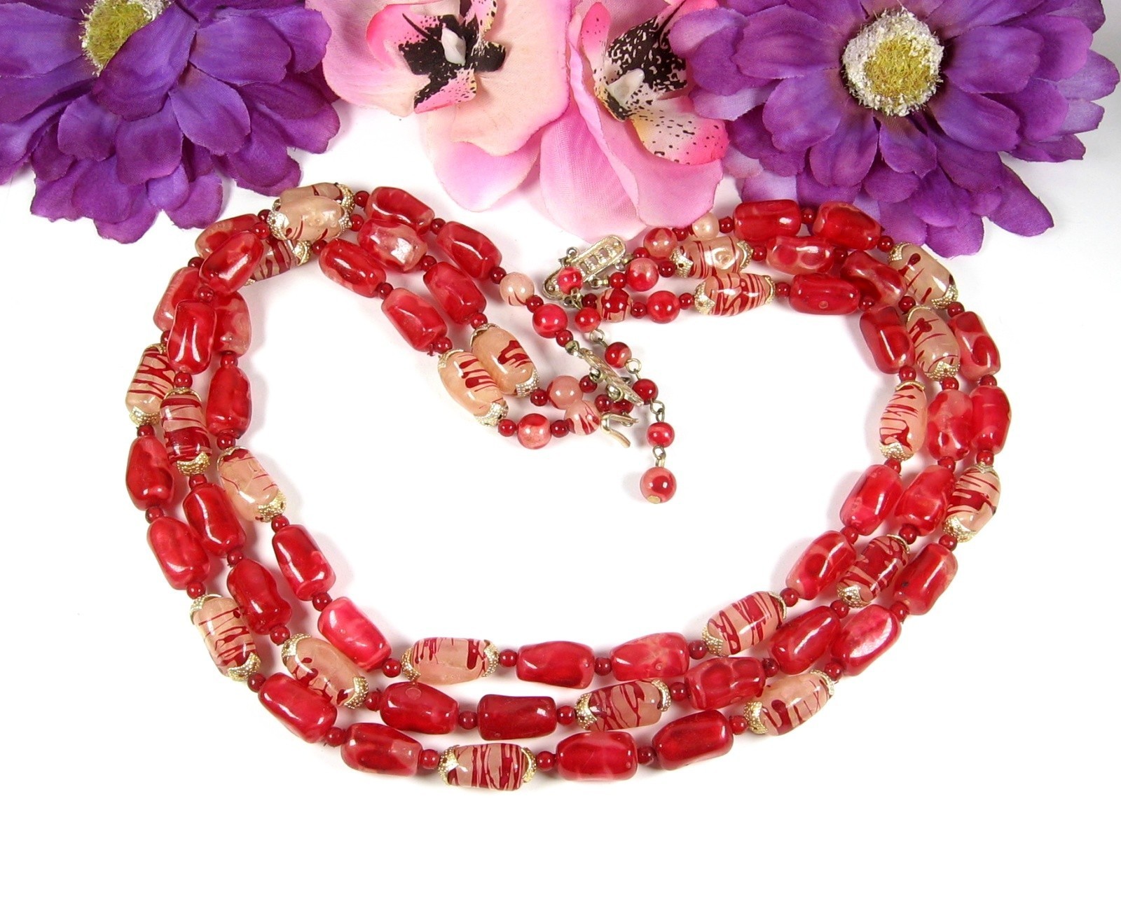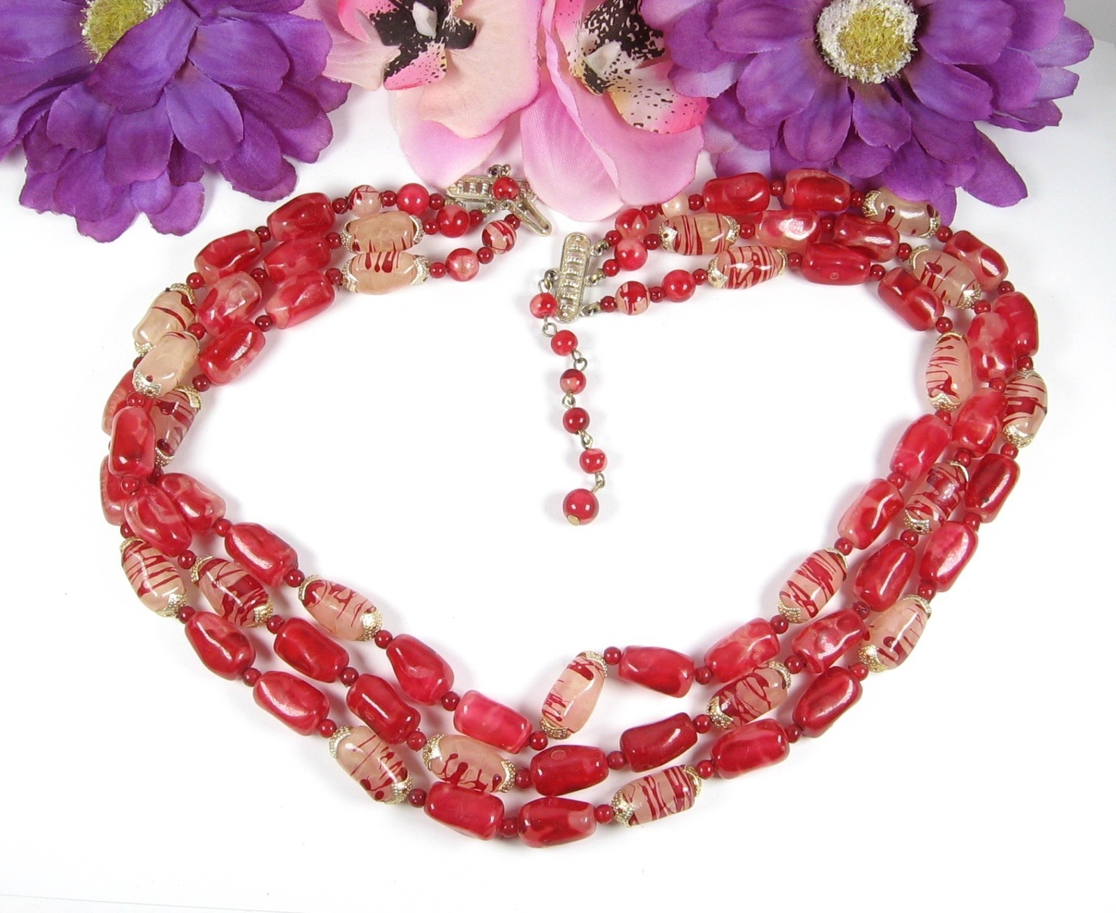 Oblong plastic beads that are in a Marbled Red color are complimented with the Milky Clear with Red Striped beads to give this triple strand beaded necklace an overall Candy Apple Red Look!