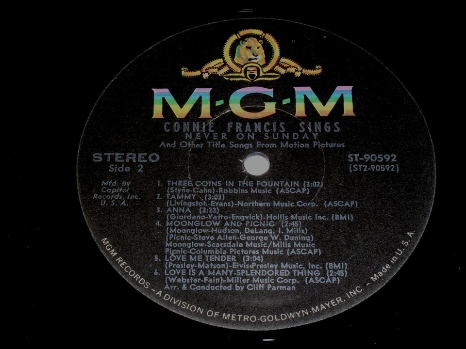 This is a vintage phonograph record album by Connie Francis, entitled, "Connie Francis Sings Never On Sunday and Other Title Songs from Motion Pictures". Record label: MGM SE3965 (Stereo).