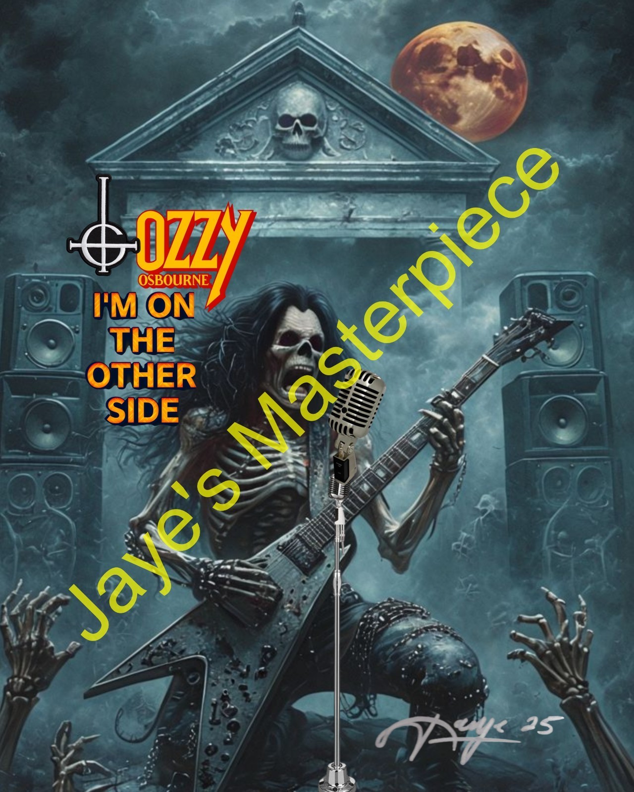 The product is a 16x20 canvas art print created by artist Jaye Metcalfe, I'm on the other side. featuring a street art theme and 3D, Art Deco style. Titled "2025 Ozzy Osbourne Back to the Beginning," this giclee print showcases men as the subject, adding a unique touch to any art collection. The hand-signed piece offers a one-of-a-kind addition to any space, blending elements of urban street art with a touch of nostalgia.