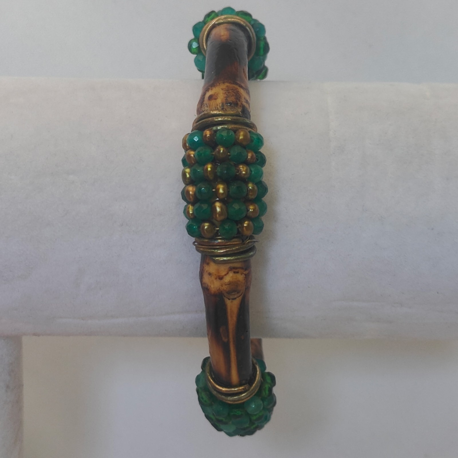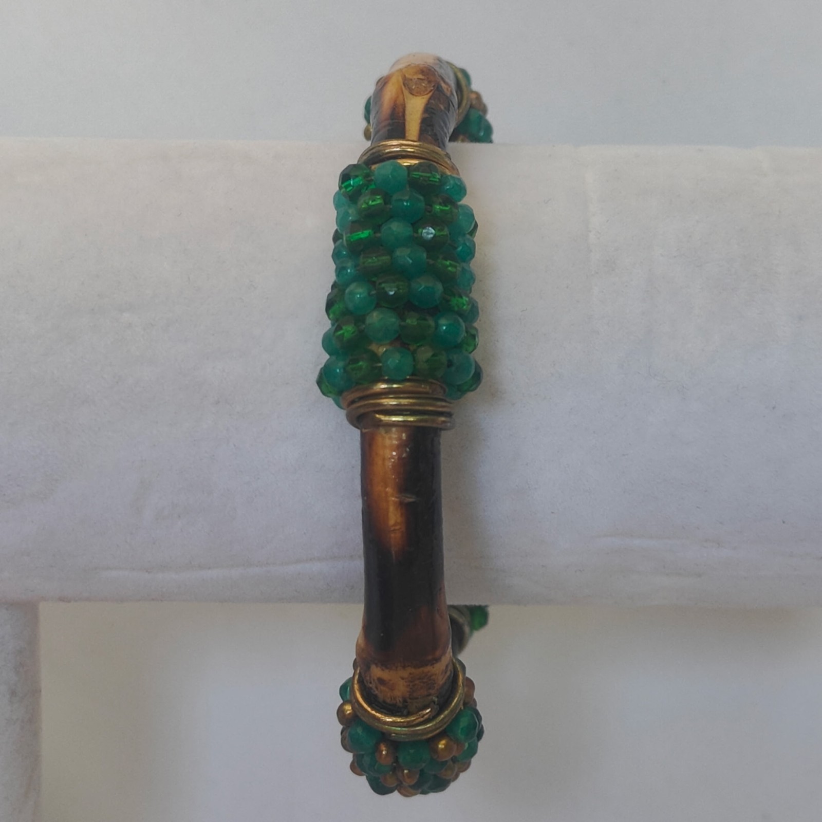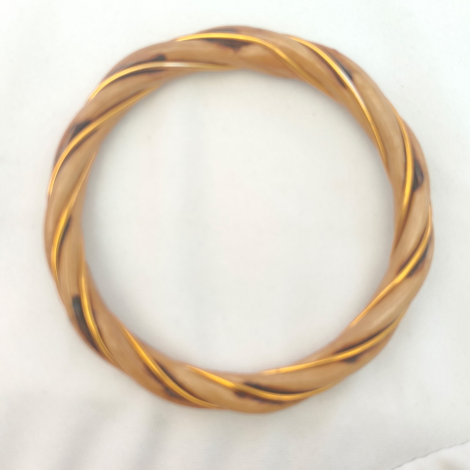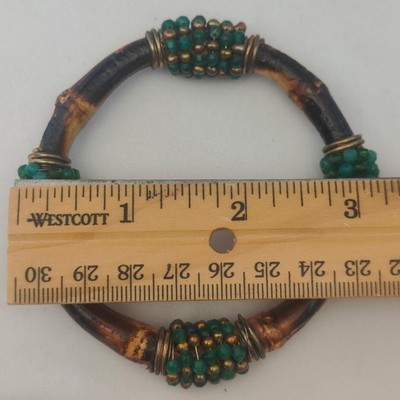 This lot of 7 bangle bracelets includes natural bamboo, wicker with gold tone wire and cinnabar style resin. The vintage-inspired pieces are stackable and adorned with a nature theme, perfect for adding a touch of elegance to any outfit. Made from natural materials, these bracelets are a unique and stylish addition to any jewelry collection.
