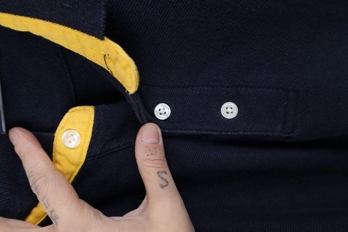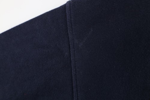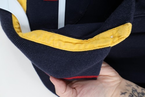 Hole front middle. Stains right shoulder/arm, inner collar. Dark spots/blemishes, discoloring throughout. Fabric pulls, pilling. Collar, arms discolored. Color faded
