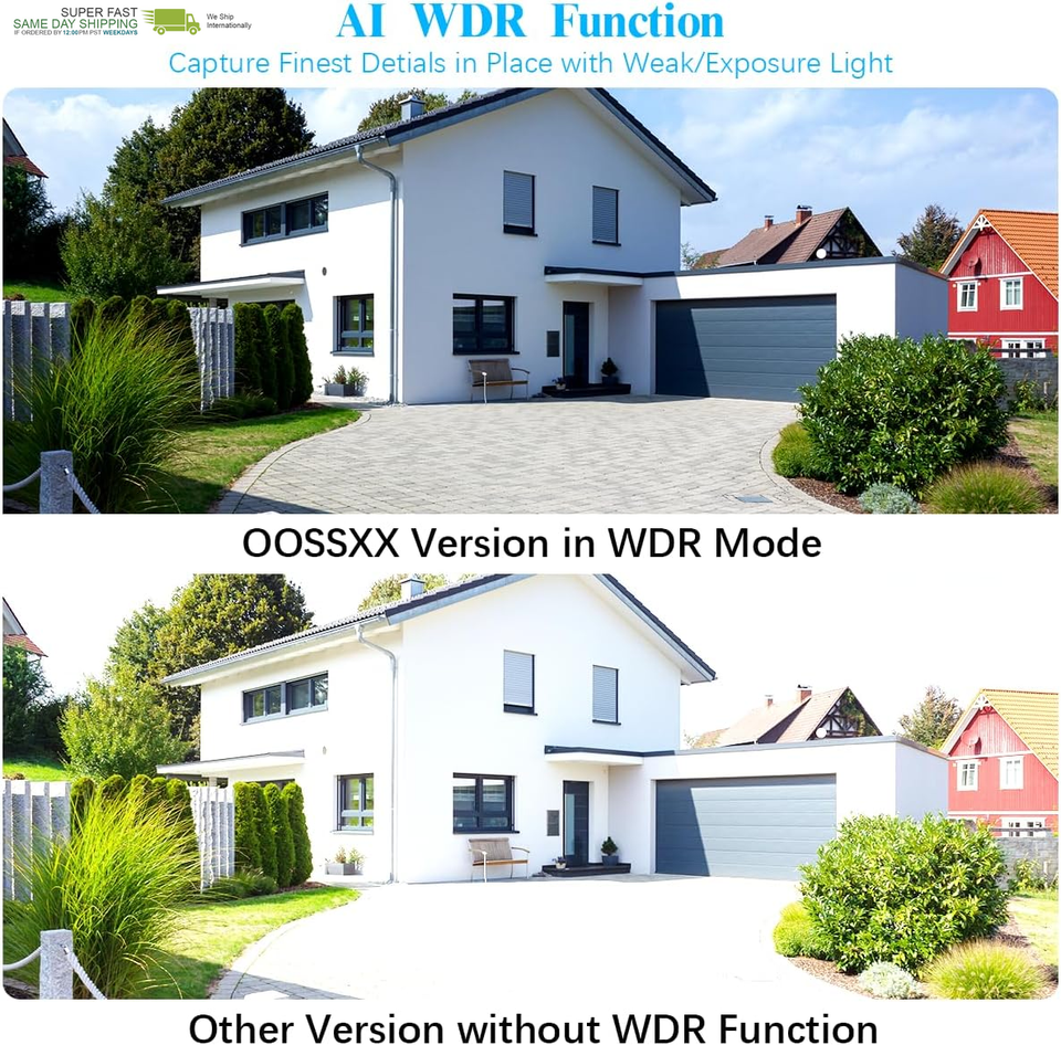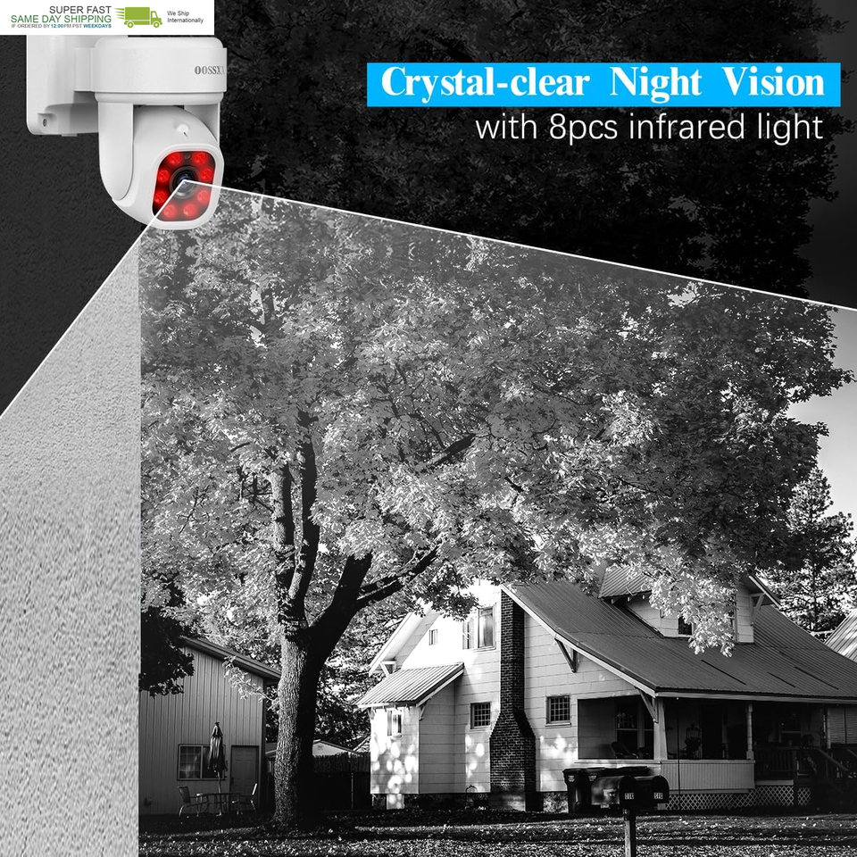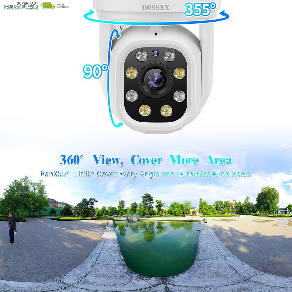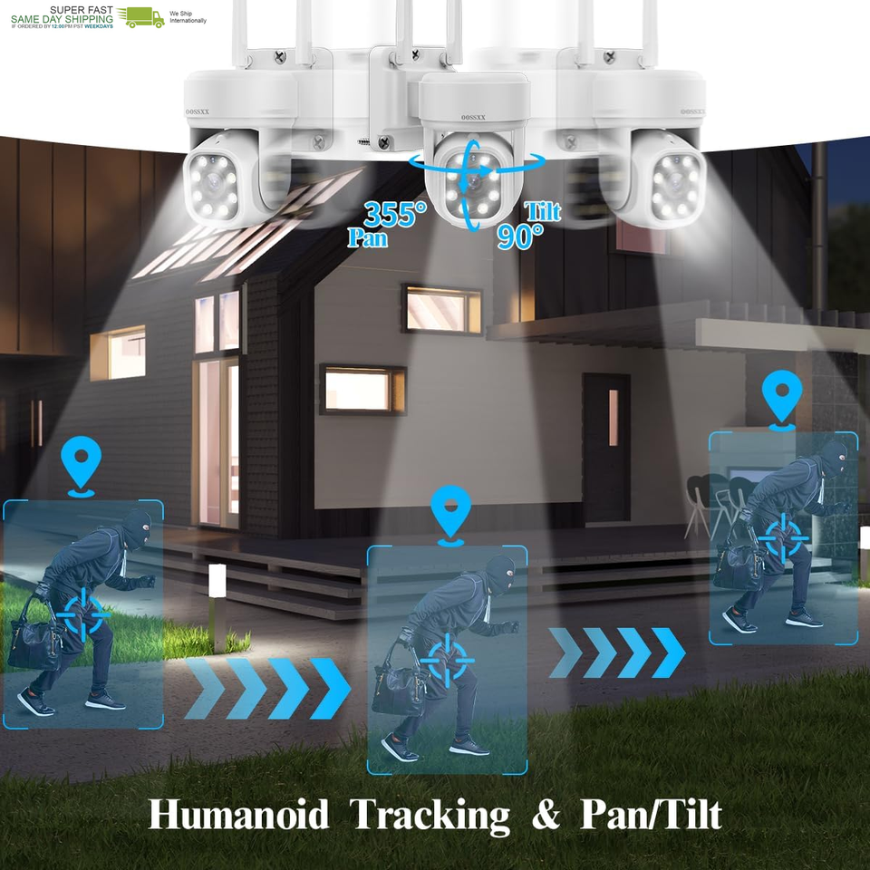 {5MP Camera Comprehensive Viewing Angle} Equipped with 4Pcs 5-Million-Pixel PTZ cameras with Super CMOS, the camera enables a crystal clear viewing on your security system. The PTZ camera can rotate all around, which avoids a dead end of surveillance-- 355horizontally 95vertically. viewing angle let you monitor wider areas to protect the safety of your family and property.