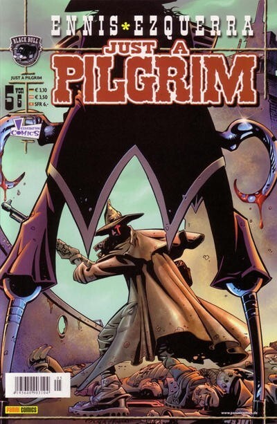 *Written by GARTH ENNIS.Art by CARLOS EZQUERRA Colors by PAUL MOUNTS Hot off the conclusion of the sensational Punisher series, Garth Ennis the creator of Preacher returns to comics with his latest creation, Just A Pilgrim, the second comic launch from Black Bull Entertainment. In the near future the sun has started to die, drying the Earth's oceans and sending civilization into chaos. In the post-apocalyptic wasteland that remains, a band of refugees searches for water on the dry ocean floor while trying to evade viscous bands of hostile pirates and bizarre creatures created from the enhanced radiation of the sun. Enter the Pilgrim, a mysterious, intensely religious man of God that quotes scripture while dispensing the Lord's harsh judgment on the unholy and unrepentant.