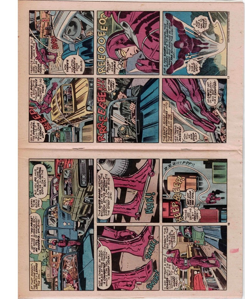 *Cover pencils by Jack Kirby, inks by Frank Giacoia. "Machine Man," script and pencils by Jack Kirby, inks by Mike Royer./ While Machine Man is busy saving the life of a hiker in danger, he is unaware that Dr. Broadhurst is receiving a government agent who is informing him that Colonel Kragg has been assigned to terminate the last surviving X-51 unit; Machine Man walks deeper into the forest where he comes across Peter Spaulding, whose van is struck behind a fallen tree; After MM moves the tree out of the way, Peter offers Machine Man a lift; They make small talk in the van until Machine Man learns that Peter is a psychiatrist and becomes uncomfortable and exits the van in traffic; Using a skateboard built into his feet, Machine Man attracts the notice of the police, who in turn alert the troops of Col. Kragg. Mr. Machine renamed Machine Man; cont'd from 2001: A Space Odyssey #10.