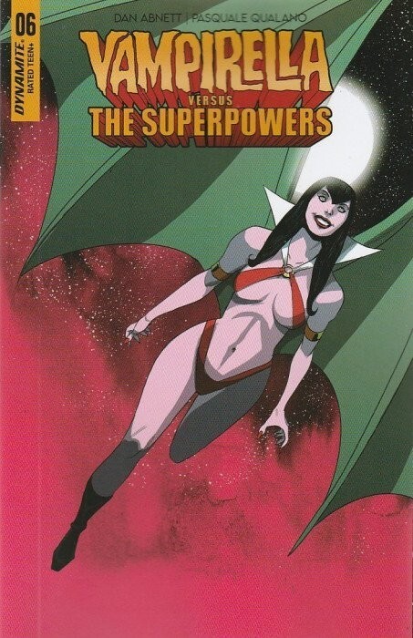 *Written by Dan Abnett. Art by Pasquale Qualano./ It's full-throttle throwback action, courtesy of superstar writer Dan Abnett (Avengers, Warhammer) and red-hot artist Pasquale Qualano (DC Vs. Vampires)! Vampirella and her trusty sidekick Dyna Might have become superheroes, and are assigned to save a world that looks strangely similar to 1940s Earth, rife with crime and corruption, and two-fisted superheroes who don't take kindly to meddling from interdimensional vampire aliens! Can Vampirella survive an onslaught of conflict from villains and heroes alike, all while solving a murder mystery and keeping her precocious sidekick alive?