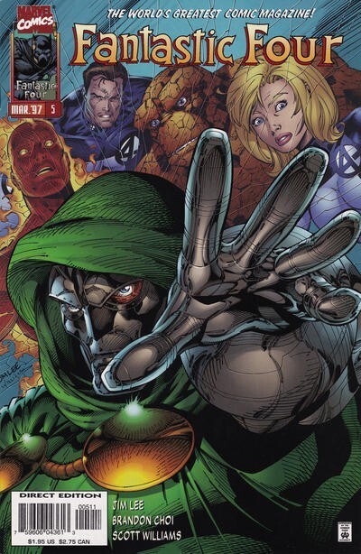 *Heroes Reborn. "Renaissance!" Story by Jim Lee and Brandon Choi. Art by Jim Lee and Scott Williams./ Witness the rebirth of the World's Greatest Comic Magazine! The greatest heroes of the Marvel Universe (The Avengers and the Fantastic Four) perished in battle with the mutant menace known as Onslaught. However, their story goes on. Told in the tradition of Stan Lee and Jack Kirby by a modern day comic's legend. Jim Lee (X-Men and WildC.A.T.s) re-imagines Marvel's first family for the new millennium. While on an experimental space flight, Doctor Reed Richards, pilot Ben Grimm, benefactor Susan Storm, and her brother Johnny Storm are bombarded by strange cosmic rays that endow them with amazing powers and abilities. Together they become the force for good known as the Fantastic Four. Includes a 6 pages feature called Time Slip. Learn what Iron Man, Doctor Doom, and Nick Fury would be like if Stan Lee created them today.