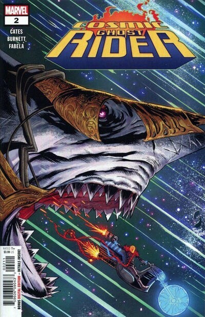 *Written by Donny Cates. Art by Dylan Burnett./ EXPLODING FROM THE PAGES OF THANOS! Frank Castle was the Punisher. A deal with the devil made him Ghost Rider. A deal with Galactus made him cosmic. A deal with Thanos made him?DEAD?!? Not to worry, he's coming back, and he's got a plan to make the universe a better place that's going to lead him into an even CRAZIER adventure than he's ever been in! The Rider is out to change the universe for the better, starting with an idea so simple he cannot believe no one has ever done it before! But as with all things worth doing, it's not going to be easy. For one thing: SPACE SHARKS. For another? Let's just say it's never good to run into Galactus during a bar fight.