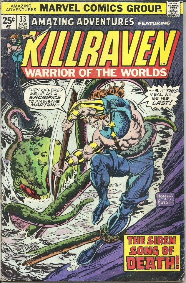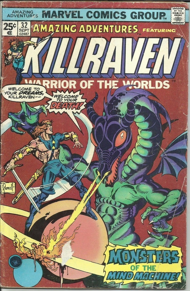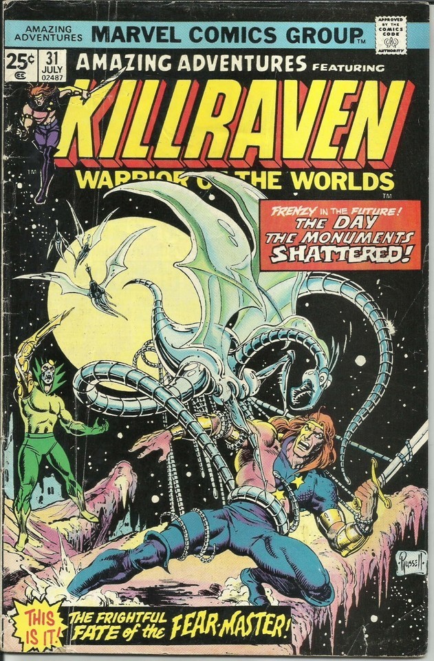 *Script by Don McGregor, art by Craig Russell./ As Eve 3031 is about to give birth to her child, Killraven and his Freemen fight off an attack made by the Death-Birth's Death Trackers which have come to destroy them; As the Freemen fight off the creatures, Sacrificer and Atalon have their troops prepare for their next attack; While in Milwaukee, Skar continues his hunt for Killraven, scarring a ship captain who'd been trapped in the frozen waters; While back in Missouri, as Adam and Eve continue to struggle with their child's birth, M'Shulla and Carmilla watch over the dying Grok and give in to their passions; Later, their downtime is interrupted with the arrival of Scarificer and Atalon, who have arrived with the giant beast, the Devourer.