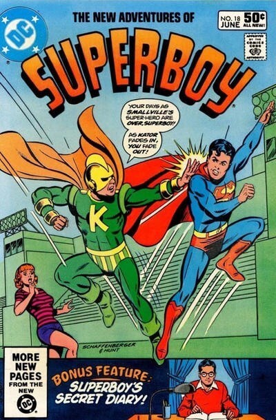 *Moosie Draper becomes Kator II (Draper will eventually be the Master Jailer) in "Superboy's Do-It-Yourself Doom!" Continued from last issue. Characters: Kator; Moosie Draper; Ma Kent; Pa Kent; Lana Lang. Written by Cary Bates, with art by Kurt Schaffenberger and Dave Hunt. Plus: 8-page Superboy's Secret Diary story "Day of the Costume Change," where Superboy tries a yellow costume. Written by Bob Rozakis, with art by Kurt Schaffenberger and Dave Hunt. Cover by Schaffenberger and Hunt. Also - Ralsa and Sar-Ul claim to be Superboy's real parents in "The Secret Time Forgot to Tell." Continued next issue. Characters: Introduction: Ralsa; Introduction: Sar-Ul; Jor-El; Lara; Ma Kent; Pa Kent; Kryptonite. Written by Cary Bates, with art by Kurt Schaffenberger and Dan Adkins. Plus: 8-page Strange Encounters of the First Time story "Superboy's Mystery Mission," where Superboy tries to rescue the Mercury astronauts.