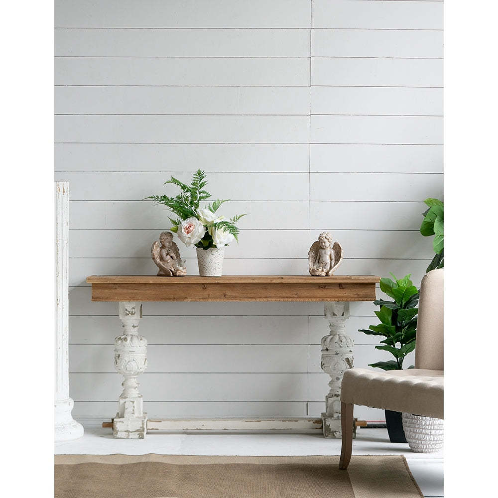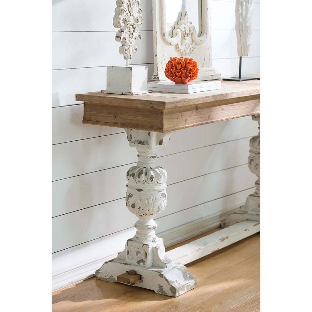 The combination of naturally-finished fir wood and a worn whitewashed finish gives this piece a warm aesthetic with the personality of a treasured heirloom.