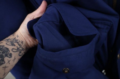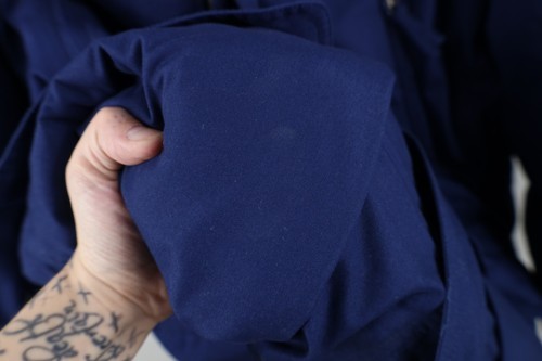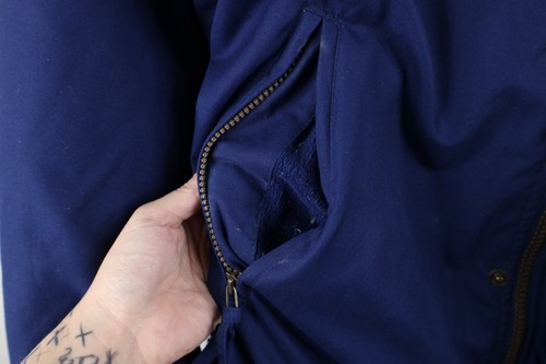 Missing the hood. Stains throughout. Collar, cuffs discolored. Color faded. Pilling