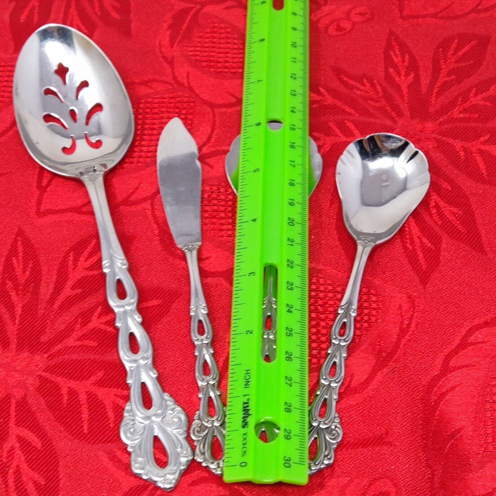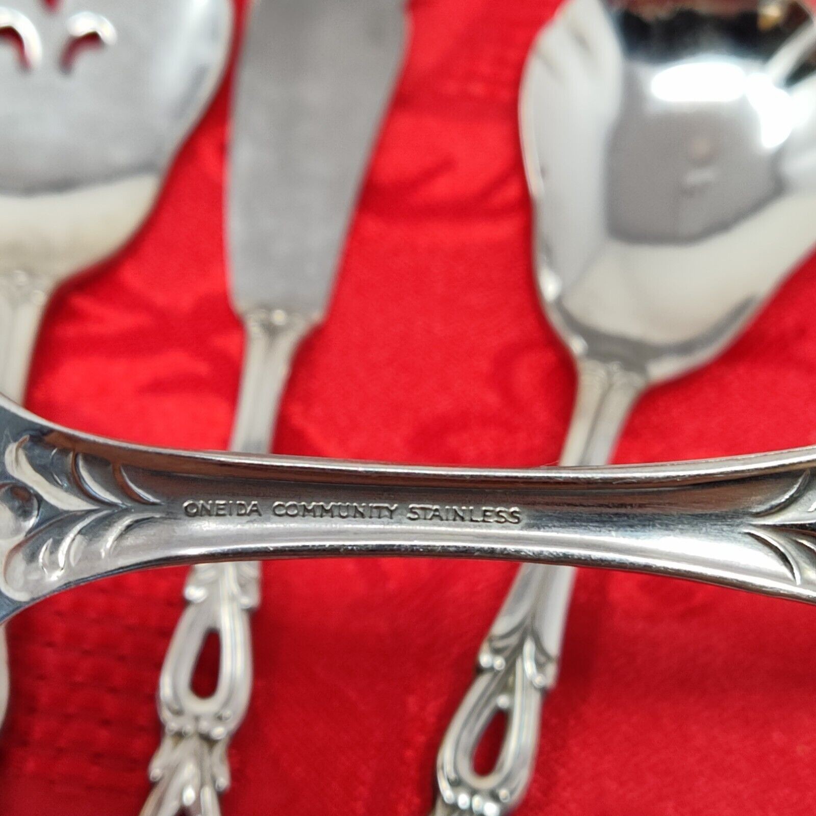 4X Oneida Community Stainless CHANDELIER 4 Piece Serving Set Slotted Sugar . Condition is Used. Shipped with USPS Ground Advantage.
