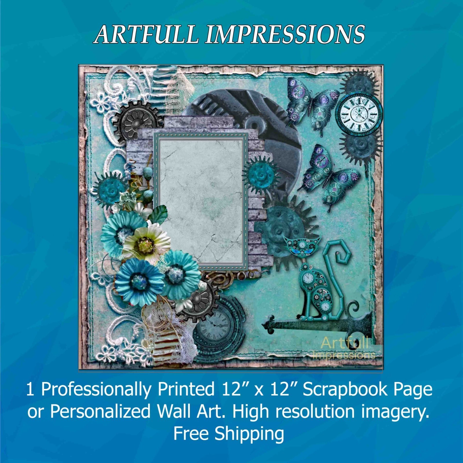 Aqua Whimsical Steampunk Cat & Butterfly Personalized Wall Art or Scrapbook Page