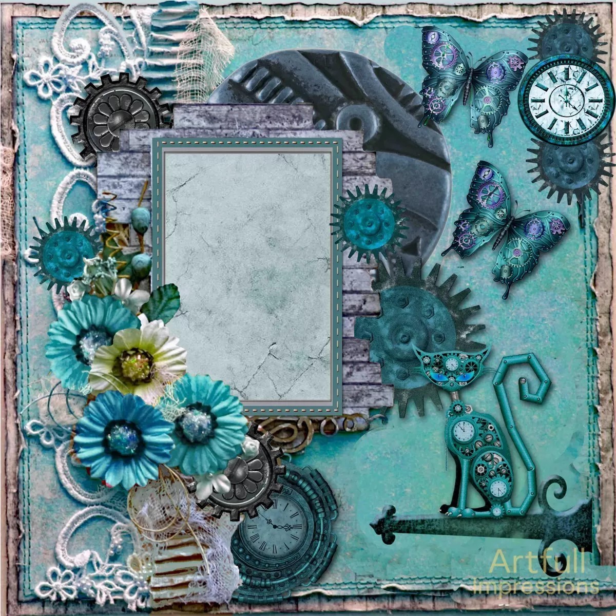 hues, metallic gears, and lace textures! This one-of-a-kind design features