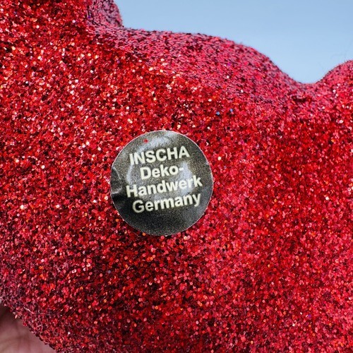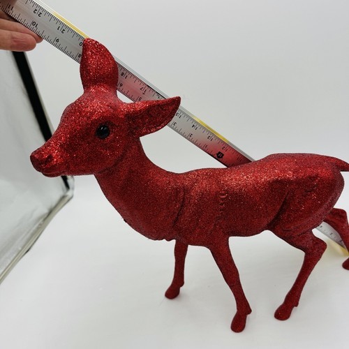 Add this beautiful INSCHA Deko Handwerk Germany figurine to your Christmas decor collection. The 15" tall reindeer is covered in red glitter, adding a touch of sparkle to your holiday season. Made from high-quality plastic, this vintage figurine is perfect for displaying on your mantel or as a centerpiece on your dining table.
