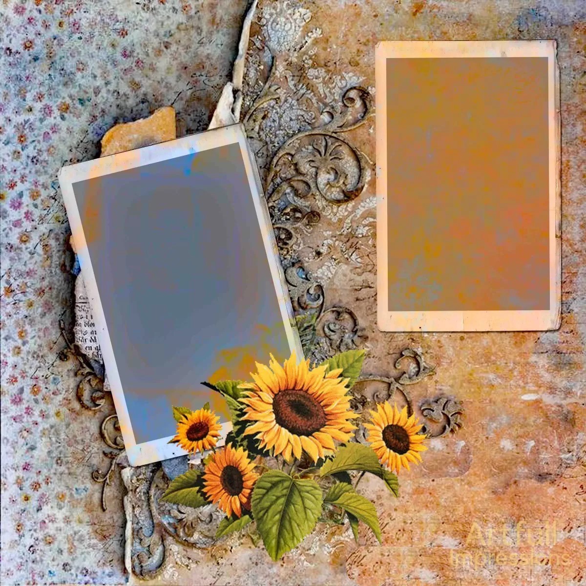 sunflower-themed layout, blending earthy textures, vintage